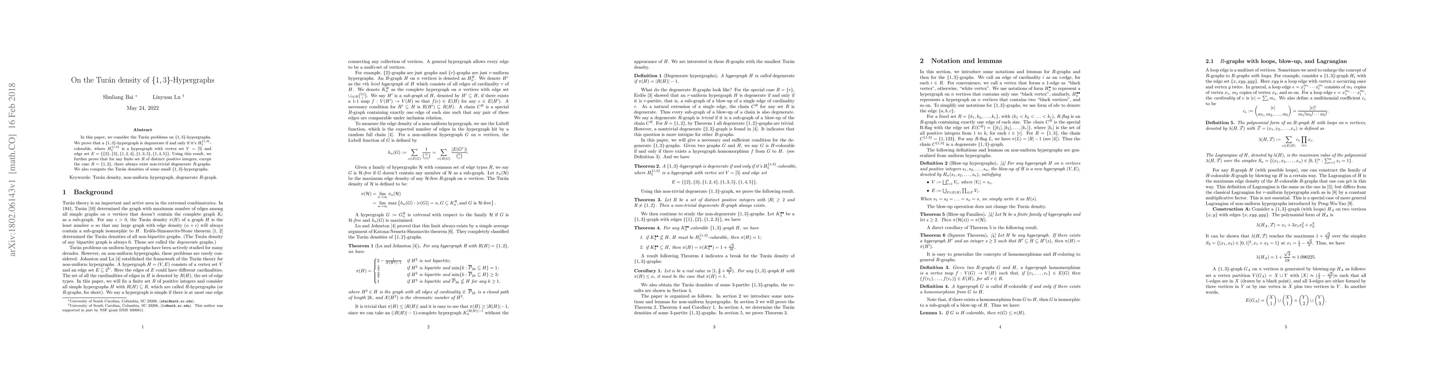 This paper investigates the Turán problems for $\{1, 3\}$-hypergraphs, proving that a $\{1, 3\}$-hypergraph is degenerate if it's $H^{\{1, 3\}}_5$-colorable, where $H^{\{1, 3\}}_5$ is a specific hypergraph. It also establishes the existence of non-trivial degenerate $R$-graphs for most sets $R$ of distinct integers and computes the Turán densities for certain small $\{1, 3\}$-hypergraphs.