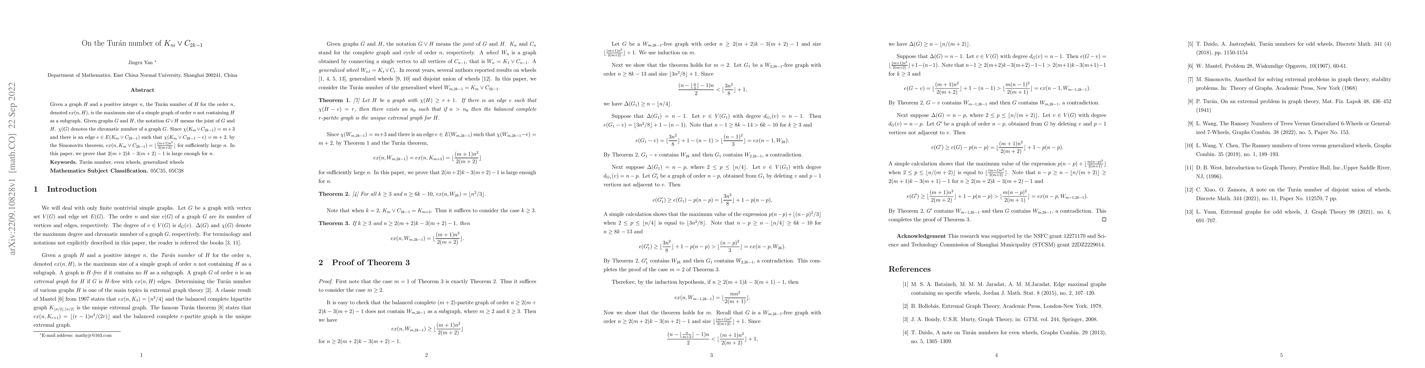 This paper calculates the Turán number for the graph $K_m \vee C_{2k-1}$, showing that for sufficiently large $n$, $ex(n, K_m \vee C_{2k-1}) = \lfloor \frac{(m+1)n^2}{2(m+2)}\rfloor$. It proves that $2(m+2)k-3(m+2)-1$ is a valid lower bound for $n$.