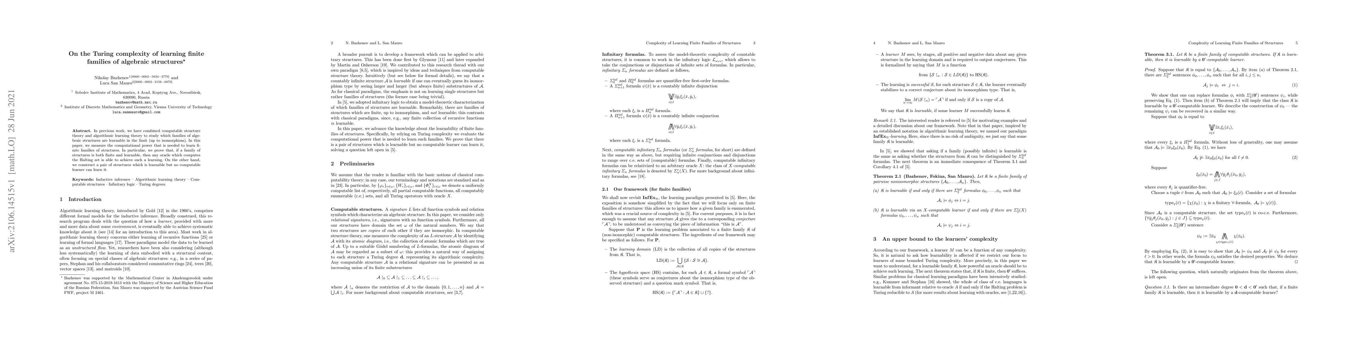 In previous work, we have combined computable structure theory and algorithmic learning theory to study which families of algebraic structures are learnable in the limit (up to isomorphism). In this paper, we measure the computational power that is needed to learn finite families of structures. In particular, we prove that, if a family of structures is both finite and learnable, then any oracle which computes the Halting set is able to achieve such a learning. On the other hand, we construct a pair of structures which is learnable but no computable learner can learn it.