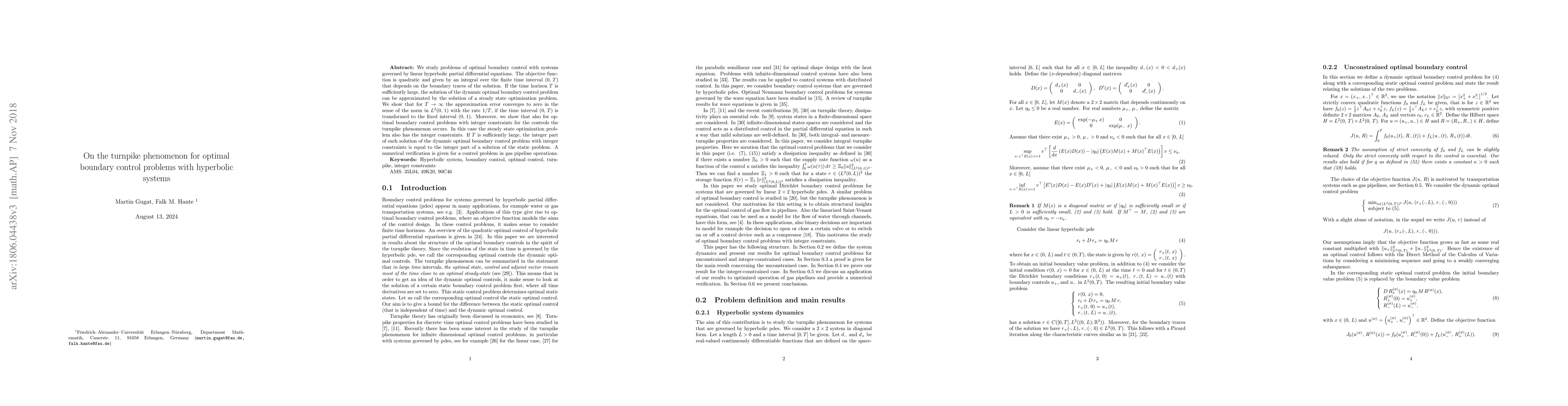 This paper investigates optimal boundary control problems for linear hyperbolic PDEs, demonstrating the turnpike phenomenon where, for large time horizons, the dynamic problem approximates a steady-state problem. The approximation error diminishes at a rate of 1/T as the time horizon increases, and this holds true even with integer constraints on the controls.
