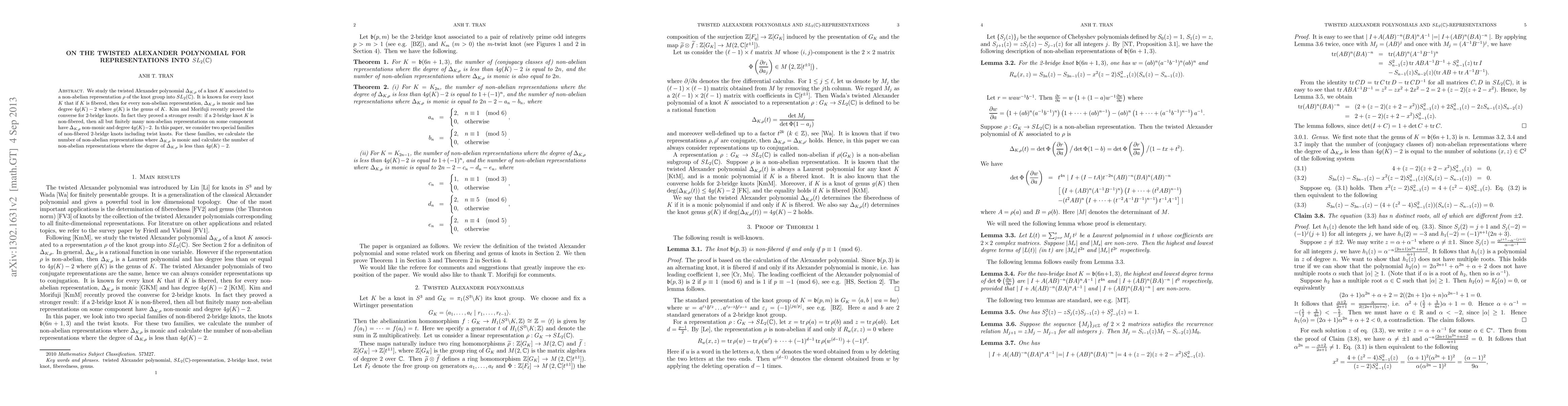We study the twisted Alexander polynomial $\Delta_{K,\rho}$ of a knot $K$ associated to a non-abelian representation $\rho$ of the knot group into $SL_2(\BC)$. It is known for every knot $K$ that if $K$ is fibered, then for every non-abelian representation, $\Delta_{K,\rho}$ is monic and has degree $4g(K)-2$ where $g(K)$ is the genus of $K$. Kim and Morifuji recently proved the converse for 2-bridge knots. In fact they proved a stronger result: if a 2-bridge knot $K$ is non-fibered, then all but finitely many non-abelian representations on some component have $\Delta_{K,\rho}$ non-monic and degree $4g(K)-2$. In this paper, we consider two special families of non-fibered 2-bridge knots including twist knots. For these families, we calculate the number of non-abelian representations where $\Delta_{K,\rho}$ is monic and calculate the number of non-abelian representations where the degree of $\Delta_{K,\rho}$ is less than $4g(K)-2$.