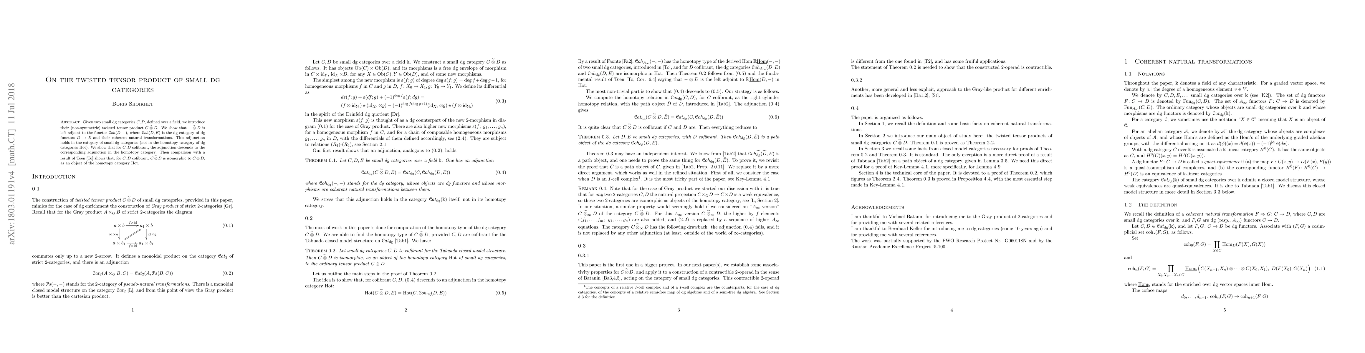 Given two small dg categories $C,D$, defined over a field, we introduce their (non-symmetric) twisted tensor product $C\overset{\sim}{\otimes} D$. We show that $-\overset{\sim}{\otimes} D$ is left adjoint to the functor $Coh(D,-)$, where $Coh(D,E)$ is the dg category of dg functors $D\to E$ and their coherent natural transformations. This adjunction holds in the category of small dg categories (not in the homotopy category of dg categories $\mathrm{Hot}$). We show that for $C,D$ cofibrant, the adjunction descends to the corresponding adjunction in the homotopy category. Then comparison with a result of To\"{e}n shows that, for $C,D$ cofibtant, $C\overset{\sim}{\otimes} D$ is isomorphic to $C\otimes D$, as an object of the homotopy category $\mathrm{Hot}$.