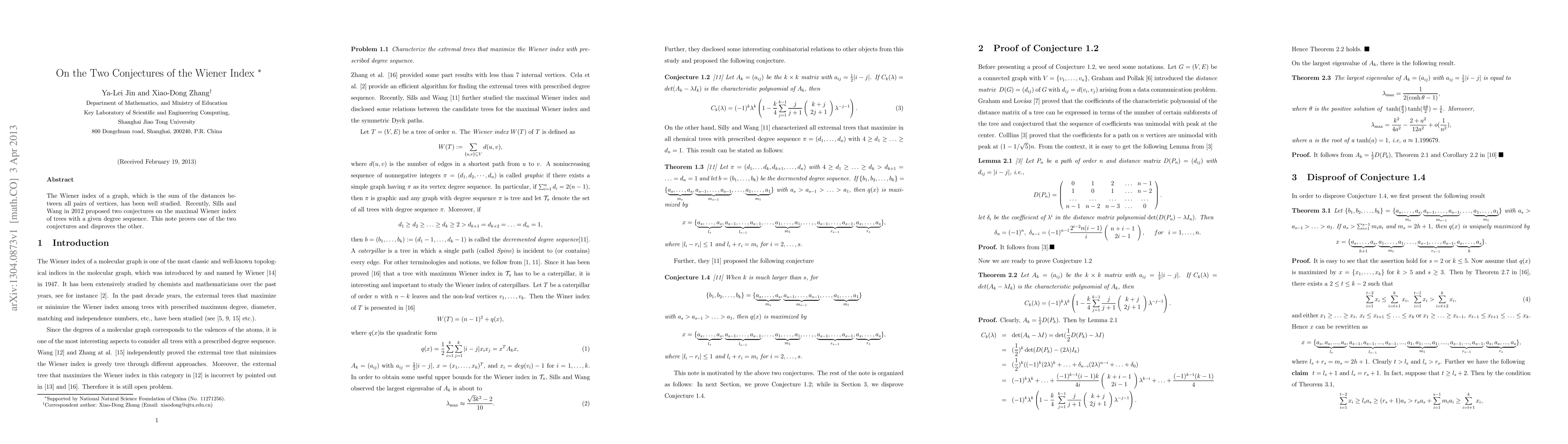 The Wiener index of a graph, which is the sum of the distances between all pairs of vertices, has been well studied. Recently, Sills and Wang in 2012 proposed two conjectures on the maximal Wiener index of trees with a given degree sequence. This note proves one of the two conjectures and disproves the other.