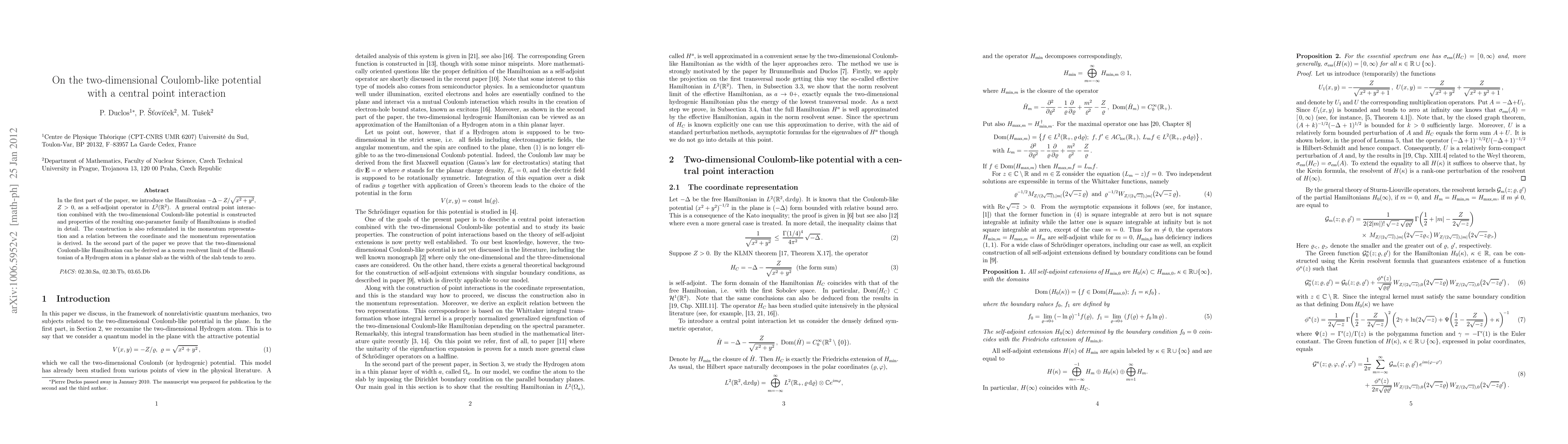 Researchers create a new Hamiltonian that combines a two-dimensional Coulomb-like potential with a central point interaction, and show it can be derived as a limit of the hydrogen atom's Hamiltonian in a planar slab.