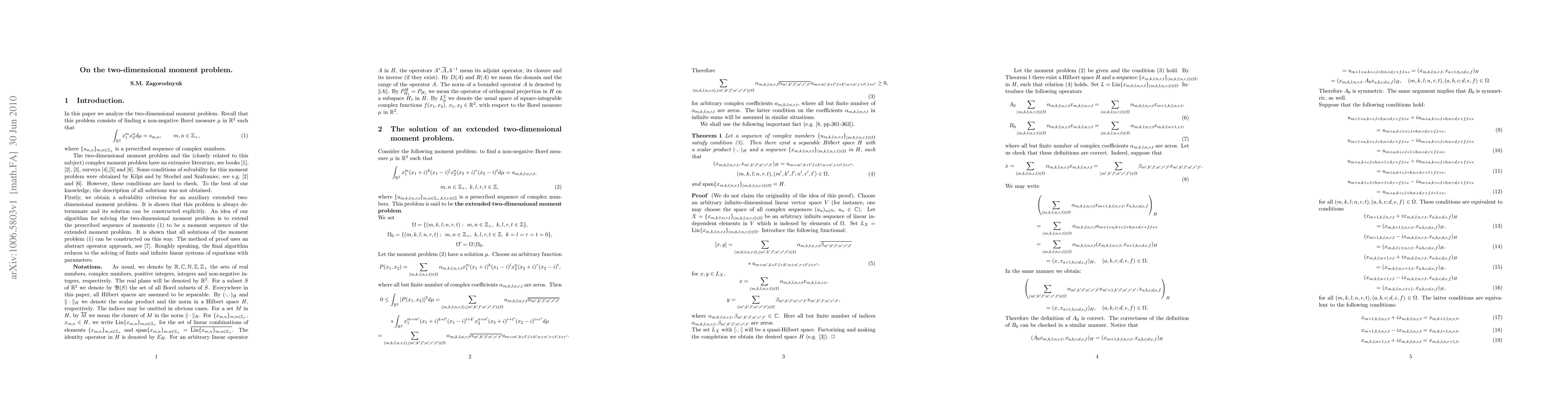 This paper presents an algorithm that provides necessary and sufficient conditions for solving the two-dimensional moment problem, demonstrating how all solutions can be constructed using this method.