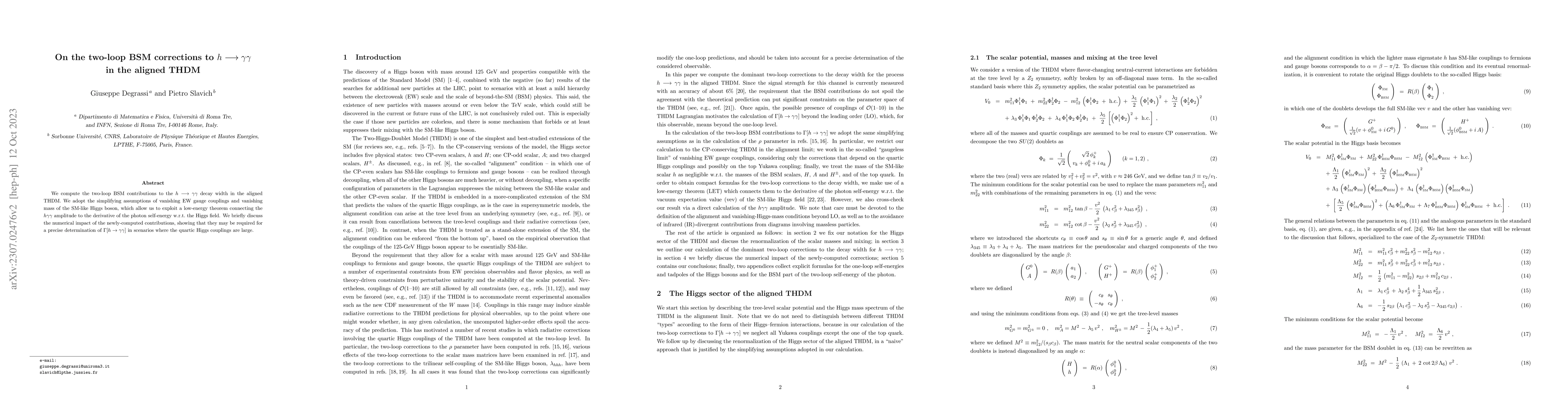 We compute the two-loop BSM contributions to the $h\longrightarrow \gamma\gamma$ decay width in the aligned THDM. We adopt the simplifying assumptions of vanishing EW gauge couplings and vanishing mass of the SM-like Higgs boson, which allow us to exploit a low-energy theorem connecting the $h\gamma\gamma$ amplitude to the derivative of the photon self-energy w.r.t. the Higgs field. We briefly discuss the numerical impact of the newly-computed contributions, showing that they may be required for a precise determination of $\Gamma[h\rightarrow \gamma \gamma]$ in scenarios where the quartic Higgs couplings are large.