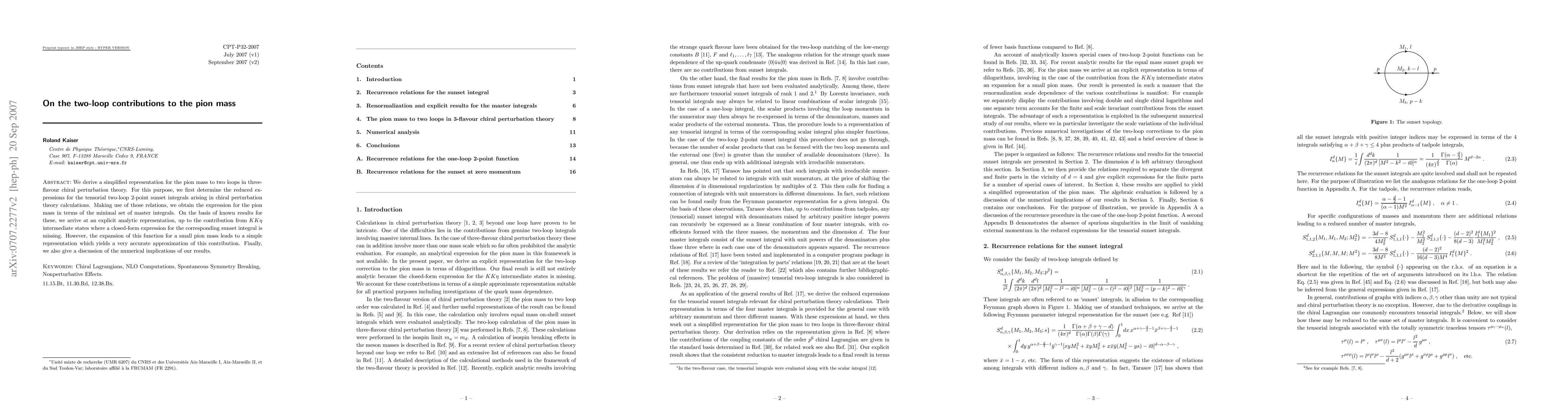 We derive a simplified representation for the pion mass to two loops in three-flavour chiral perturbation theory. For this purpose, we first determine the reduced expressions for the tensorial two-loop 2-point sunset integrals arising in chiral perturbation theory calculations. Making use of those relations, we obtain the expression for the pion mass in terms of the minimal set of master integrals. On the basis of known results for these, we arrive at an explicit analytic representation, up to the contribution from K-K-eta intermediate states where a closed-form expression for the corresponding sunset integral is missing. However, the expansion of this function for a small pion mass leads to a simple representation which yields a very accurate approximation of this contribution. Finally, we also give a discussion of the numerical implications of our results.