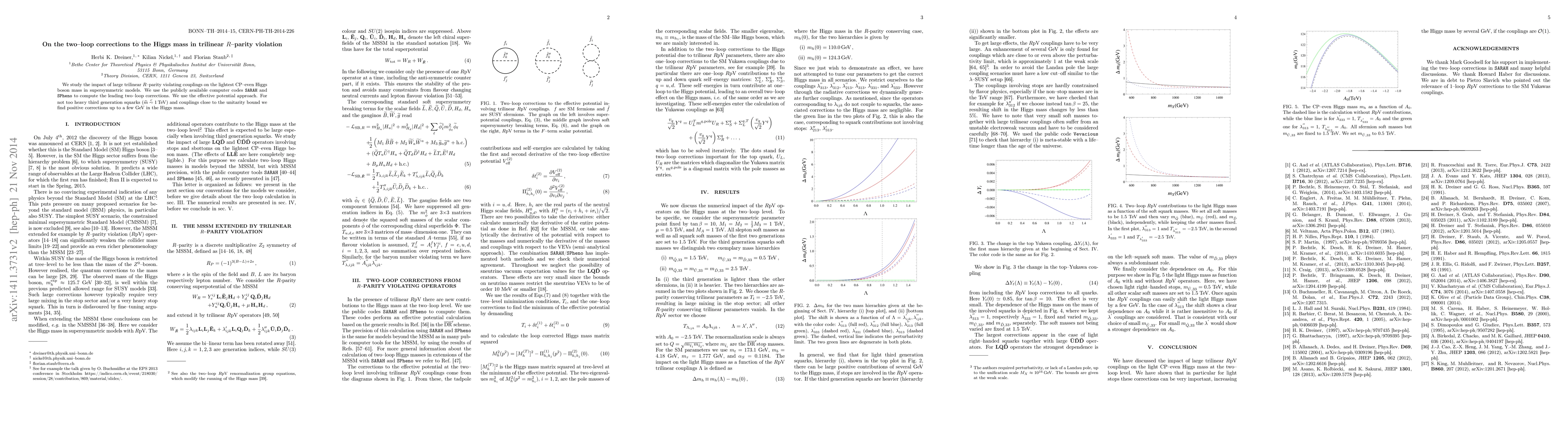 This paper investigates the two-loop corrections to the Higgs mass in supersymmetric models with trilinear R-parity violation, finding positive corrections up to a few GeV when third-generation squarks are lighter than 1 TeV and couplings approach the unitarity bound. Calculations utilize the SARAH and SPheno codes with the effective potential approach.