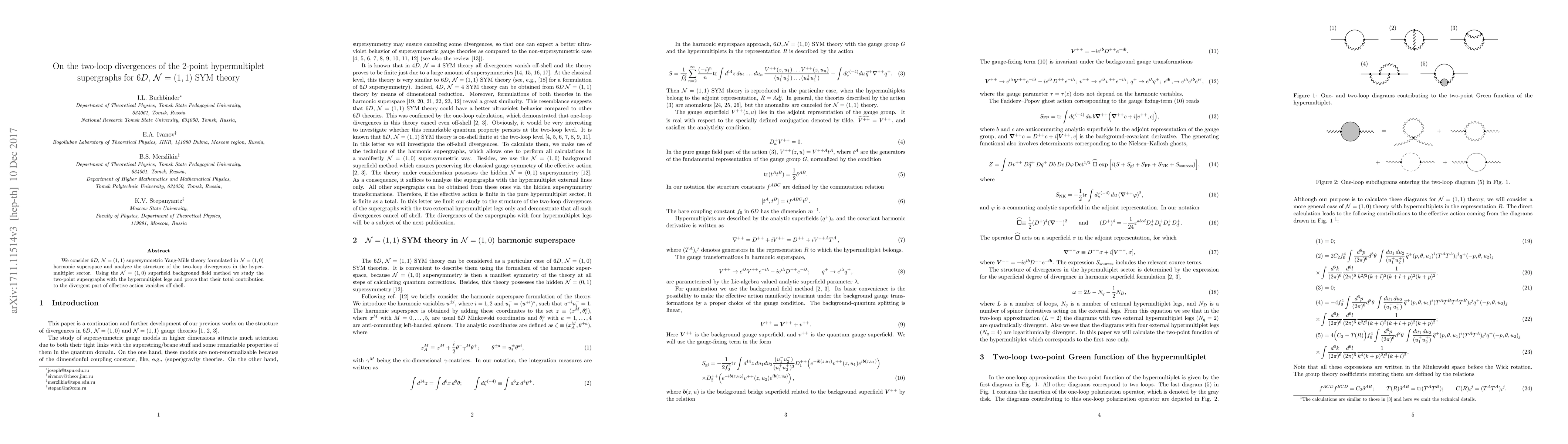 We consider $6D$, ${\cal N}=(1,1)$ supersymmetric Yang-Mills theory formulated in ${\cal N}=(1,0)$ harmonic superspace and analyze the structure of the two-loop divergences in the hypermultiplet sector. Using the ${\cal N}=(1,0)$ superfield background field method we study the two-point supergraphs with the hypermultiplet legs and prove that their total contribution to the divergent part of effective action vanishes off shell.
