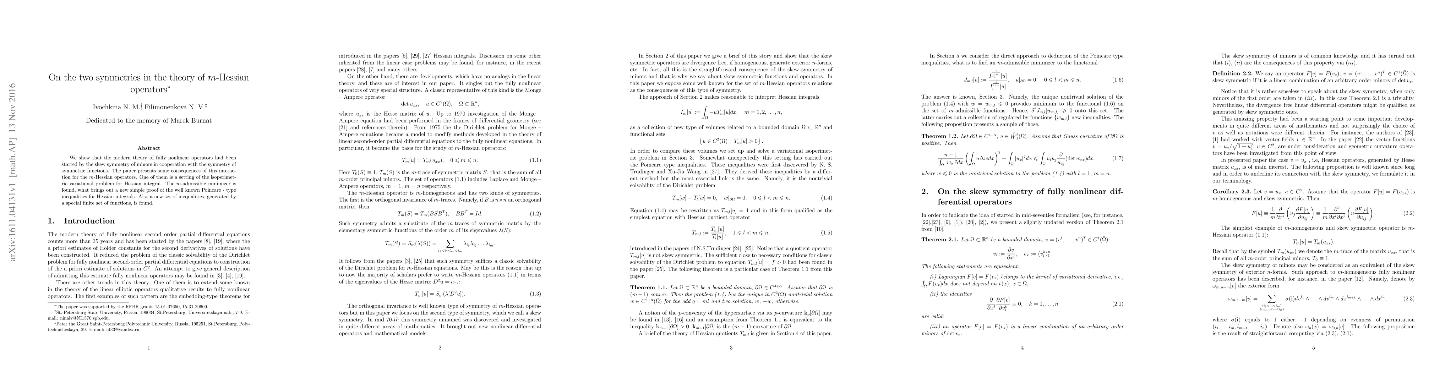 We show that the modern theory of fully nonlinear operators had been started by the skew symmetry of minors in cooperation with the symmetry of symmetric functions. The paper presents some consequences of this interaction for the m-Hessian operators. One of them is a setting of the isoperimetric variational problem for Hessian integral. The m-admissible minimizer is found, what brings out a new simple proof of the well known Poincare - type inequalities for Hessian integrals. Also a new set of inequalities, generated by a special finite set of functions, is found.