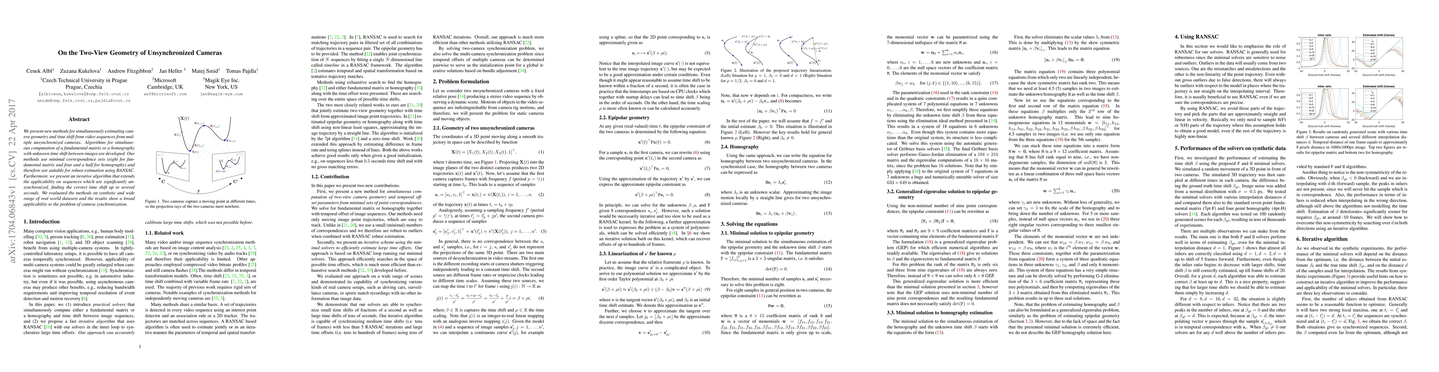 We present new methods for simultaneously estimating camera geometry and time shift from video sequences from multiple unsynchronized cameras. Algorithms for simultaneous computation of a fundamental matrix or a homography with unknown time shift between images are developed. Our methods use minimal correspondence sets (eight for fundamental matrix and four and a half for homography) and therefore are suitable for robust estimation using RANSAC. Furthermore, we present an iterative algorithm that extends the applicability on sequences which are significantly unsynchronized, finding the correct time shift up to several seconds. We evaluated the methods on synthetic and wide range of real world datasets and the results show a broad applicability to the problem of camera synchronization.
