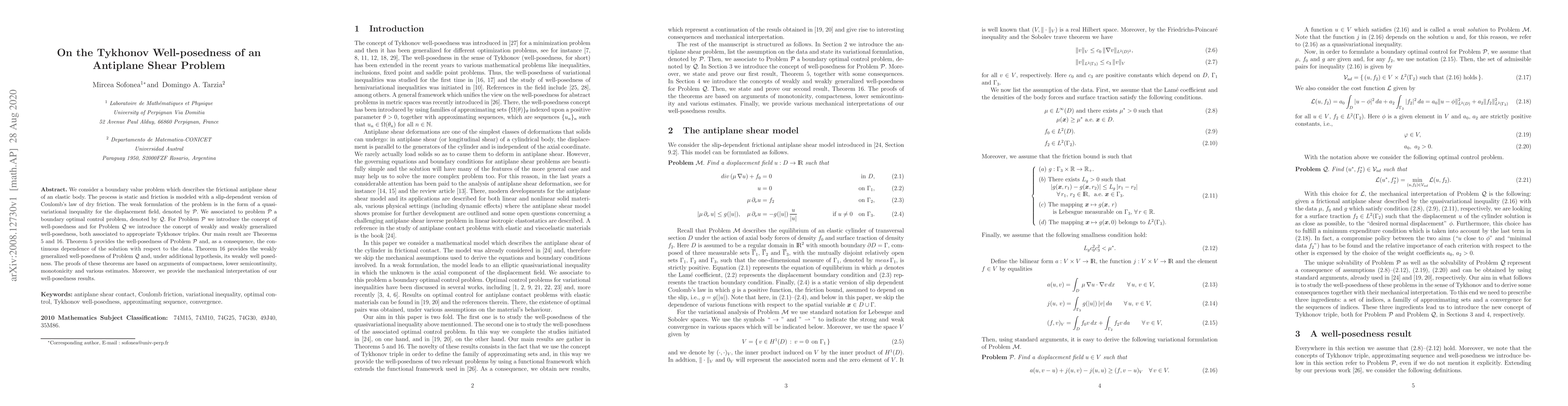 We consider a boundary value problem which describes the frictional antiplane shear of an elastic body. The process is static and friction is modeled with a slip-dependent version of Coulomb's law of dry friction. The weak formulation of the problem is in the form of a quasivariational inequality for the displacement field, denoted by $\cP$. We associated to problem $\cP$ a boundary optimal control problem, denoted by $\cQ$. For Problem $\cP$ we introduce the concept of well-posedness and for Problem $\cQ$ we introduce the concept of weakly and weakly generalized well-posedness, both associated to appropriate Tykhonov triples. Our main result are Theorems \ref{t1} and \ref{t2}. Theorem \ref{t1} provides the well-posedness of Problem $\cP$ and, as a consequence, the continuous dependence of the solution with respect to the data. Theorem \ref{t2} provides the weakly generalized well-posedness of Problem $\cQ$ and, under additional hypothesis, its weakly well posedness. The proofs of these theorems are based on arguments of compactness, lower semicontinuity, monotonicity and various estimates. Moreover, we provide the mechanical interpretation of our well-posedness results.