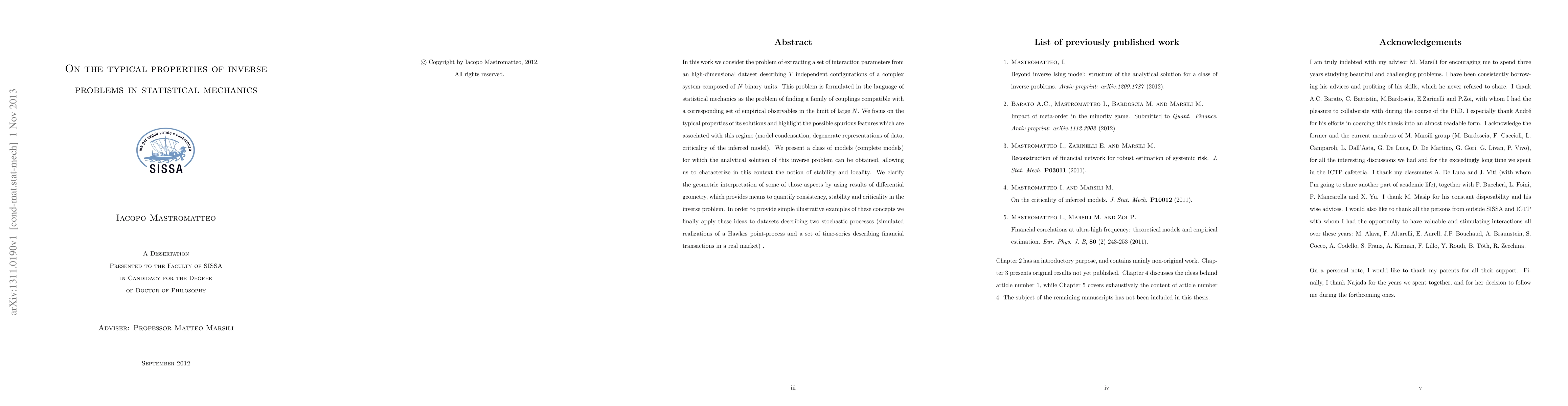In this work we consider the problem of extracting a set of interaction parameters from an high-dimensional dataset describing T independent configurations of a complex system composed of N binary units. This problem is formulated in the language of statistical mechanics as the problem of finding a family of couplings compatible with a corresponding set of empirical observables in the limit of large N. We focus on the typical properties of its solutions and highlight the possible spurious features which are associated with this regime (model condensation, degenerate representations of data, criticality of the inferred model). We present a class of models (complete models) for which the analytical solution of this inverse problem can be obtained, allowing us to characterize in this context the notion of stability and locality. We clarify the geometric interpretation of some of those aspects by using results of differential geometry, which provides means to quantify consistency, stability and criticality in the inverse problem. In order to provide simple illustrative examples of these concepts we finally apply these ideas to datasets describing two stochastic processes (simulated realizations of a Hawkes point-process and a set of time-series describing financial transactions in a real market).