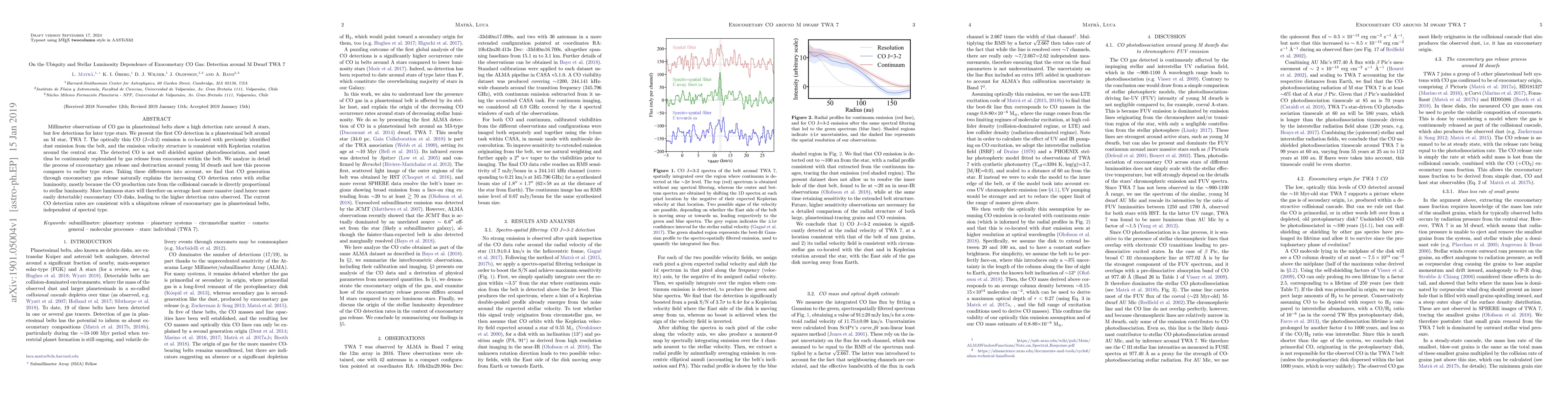 This paper reports the first detection of CO gas in the planetesimal belt around an M dwarf star, TWA 7, suggesting that CO generation through exocometary gas release is common across different stellar types. The study finds that higher stellar luminosity correlates with increased CO detection rates due to more massive and detectable exocometary CO disks.