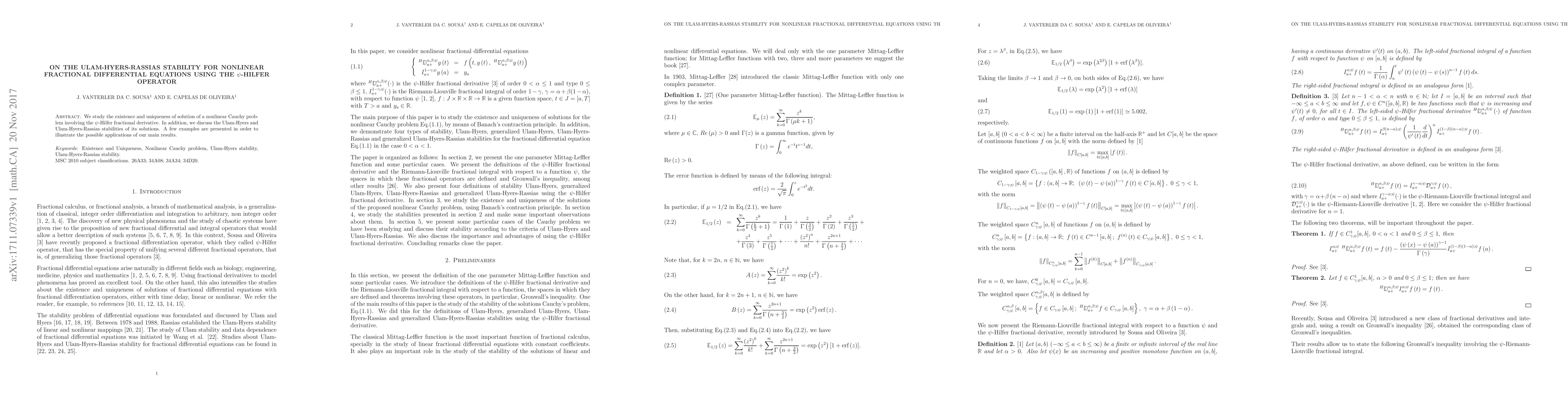 This paper investigates the existence and uniqueness of solutions for nonlinear fractional differential equations using the $\psi$-Hilfer operator, and explores the Ulam-Hyers and Ulam-Hyers-Rassias stabilities of these solutions, supplemented by illustrative examples.