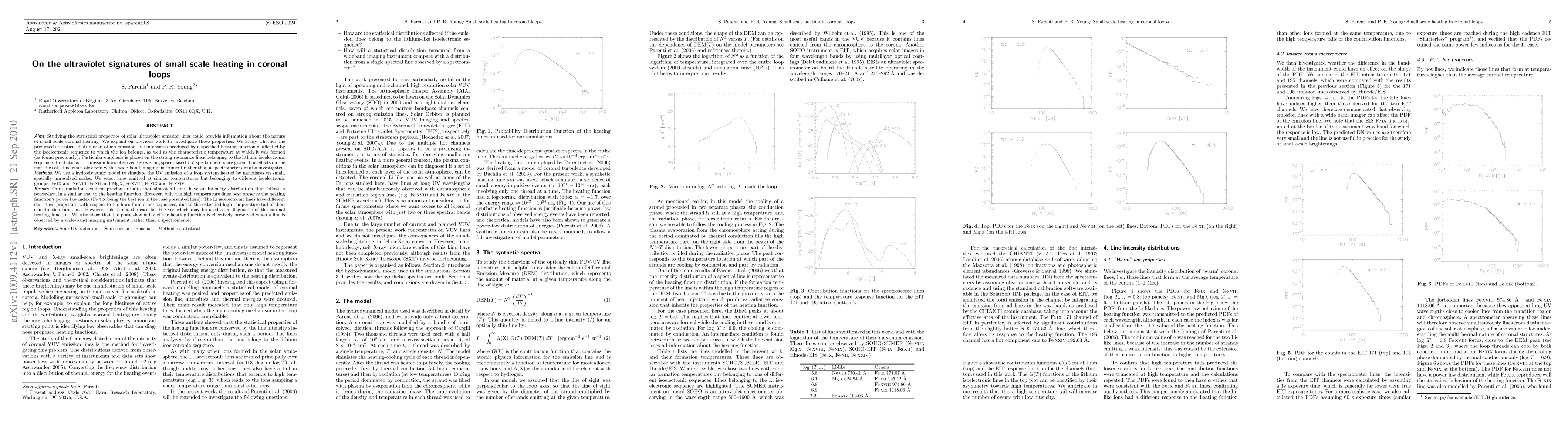 This research investigates the impact of small-scale coronal heating on ultraviolet (UV) emission lines from the Sun. Using a hydrodynamic model, the study simulates a coronal loop system heated by nanoflares, focusing on specific lines from different isoelectronic sequences like Fe IX-XIX and Li. The results show that most lines' intensity distributions follow a power-law similar to the heating function, with high-temperature lines like Fe XIX and Fe XXIV best preserving this index. Interestingly, Li lines, due to their extended high-temperature contribution function, have different statistical properties. The study also confirms that power-law indices of the heating function remain intact when observed by wide-band imaging instruments rather than spectrometers.