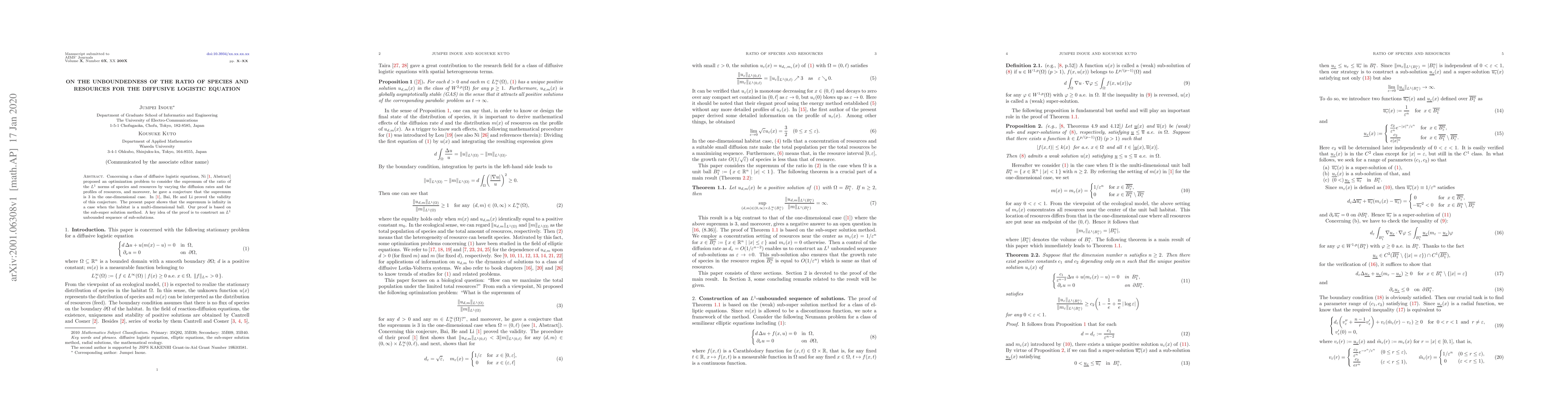 Concerning a class of diffusive logistic equations, Ni [1, Abstract] proposed an optimization problem to consider the supremum of the ratio of the L^1 norms of species and resources by varying the diffusion rates and the profiles of resources, and moreover, he gave a conjecture that the supremum is 3 in the one-dimensional case. In [1], Bai, He and Li proved the validity of this conjecture. The present paper shows that the supremum is infinity in a case when the habitat is a multi-dimensional ball. Our proof is based on the sub-super solution method. A key idea of the proof is to construct an L^1 unbounded sequence of sub-solutions.