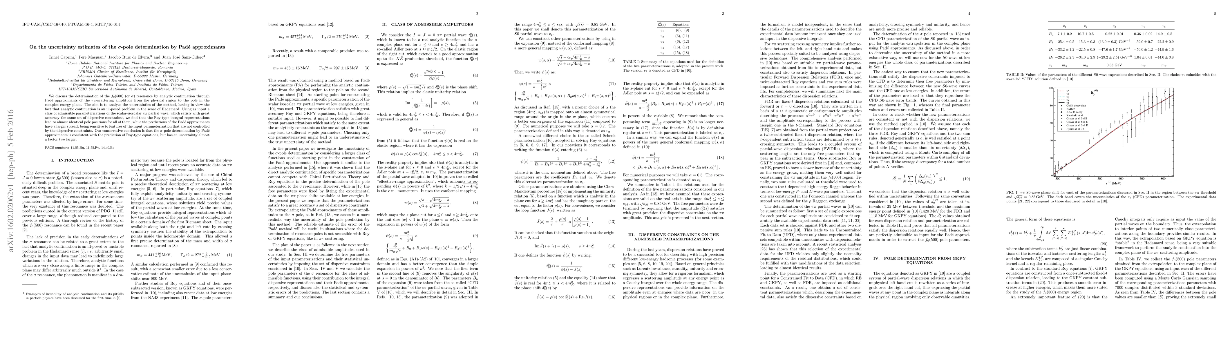 We discuss the determination of the $f_0(500)$ (or $\sigma$) resonance by analytic continuation through Pad\'e approximants of the $\pi\pi$-scattering amplitude from the physical region to the pole in the complex energy plane. The aim is to analyze the uncertainties of the method, having in view the fact that analytic continuation is an ill-posed problem in the sense of Hadamard. Using as input a class of admissible parameterizations of the scalar-isoscalar $\pi\pi$ partial wave, which satisfy with great accuracy the same set of dispersive constraints, we find that the Roy-type integral representations lead to almost identical pole positions for all of them, while the predictions of the Pad\'e approximants have a larger spread, being sensitive to features of the input parameterization that are not controlled by the dispersive constraints. Our conservative conclusion is that the $\sigma$-pole determination by Pad\'e approximants is consistent with the prediction of Roy-type equations, but has an uncertainty almost a factor two larger.