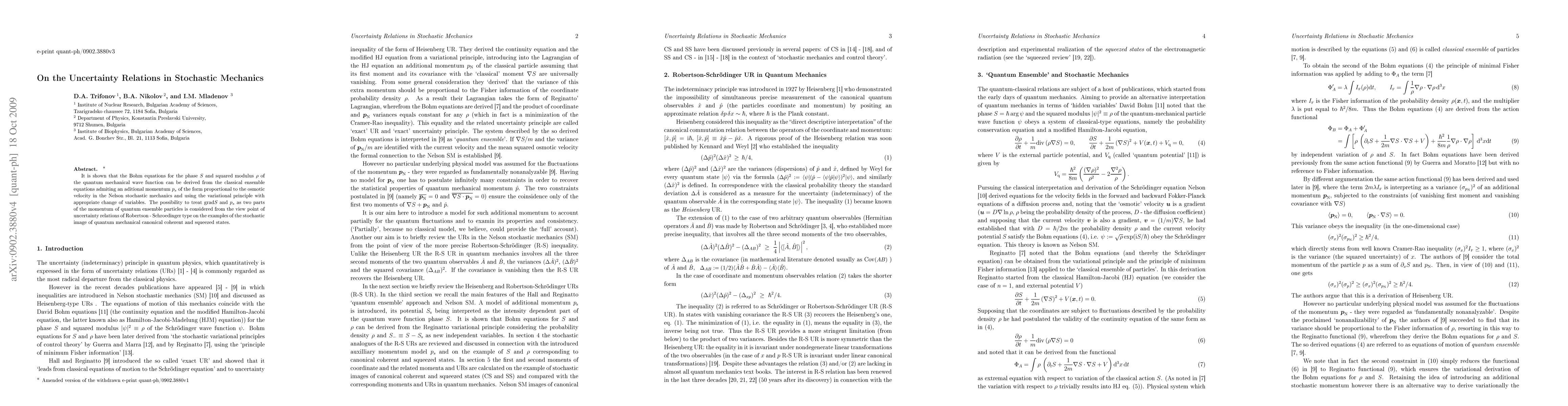 This paper derives Bohm equations for quantum mechanics from classical ensemble equations in stochastic mechanics, introducing an additional momentum proportional to the osmotic velocity. It explores uncertainty relations in the context of stochastic representations of quantum coherent and squeezed states.