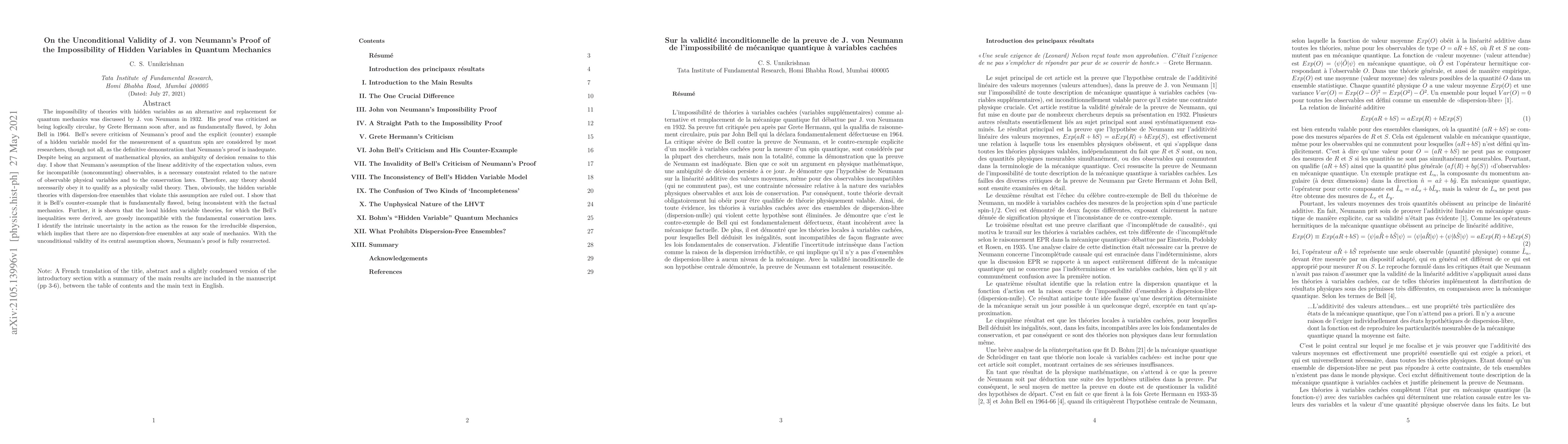 The impossibility of theories with hidden variables as an alternative and replacement for quantum mechanics was discussed by J. von Neumann in 1932. His proof was criticized as being logically circular, by Grete Hermann soon after, and as fundamentally flawed, by John Bell in 1964. Bell's severe criticism of Neumann's proof and the explicit (counter) example of a hidden variable model for the measurement of a quantum spin are considered by most researchers, though not all, as the definitive demonstration that Neumann's proof is inadequate. Despite being an argument of mathematical physics, an ambiguity of decision remains to this day. I show that Neumann's assumption of the linear additivity of the expectation values, even for incompatible (noncommuting) observables, is a necessary constraint related to the nature of observable physical variables and to the conservation laws. Therefore, any theory should necessarily obey it to qualify as a physically valid theory. Then, obviously, the hidden variable theories with dispersion-free ensembles that violate this assumption are ruled out. I show that it is Bell's counter-example that is fundamentally flawed, being inconsistent with the factual mechanics. Further, it is shown that the local hidden variable theories, for which the Bell's inequalities were derived, are grossly incompatible with the fundamental conservation laws. I identify the intrinsic uncertainty in the action as the reason for the irreducible dispersion, which implies that there are no dispersion-free ensembles at any scale of mechanics. With the unconditional validity of its central assumption shown, Neumann's proof is fully resurrected.