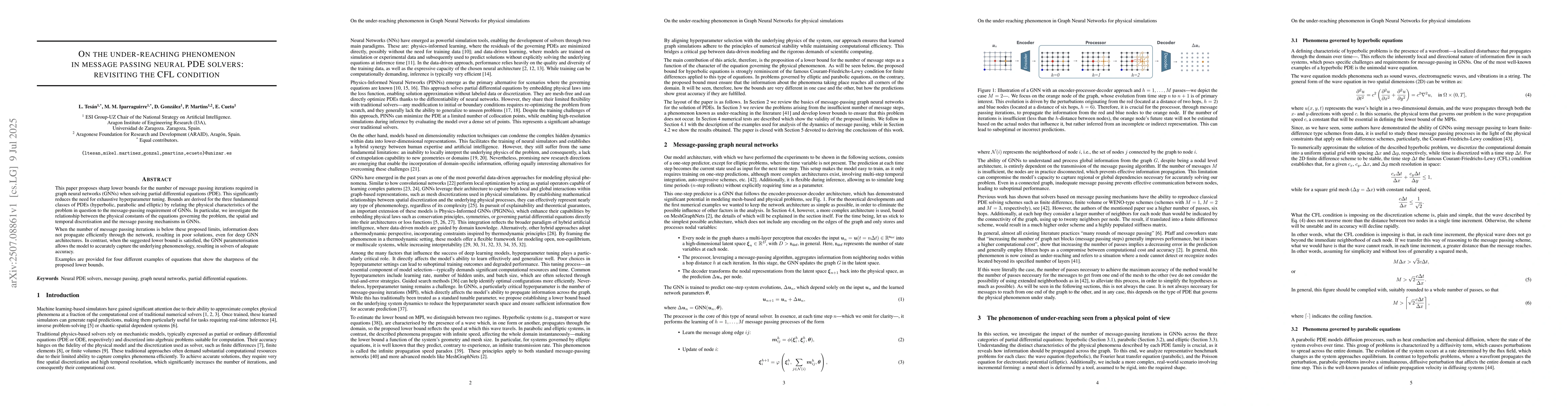 This paper proposes sharp lower bounds for the number of message passing iterations required in graph neural networks (GNNs) when solving partial differential equations (PDE). This significantly reduces the need for exhaustive hyperparameter tuning. Bounds are derived for the three fundamental classes of PDEs (hyperbolic, parabolic and elliptic) by relating the physical characteristics of the problem in question to the message-passing requirement of GNNs. In particular, we investigate the relationship between the physical constants of the equations governing the problem, the spatial and temporal discretisation and the message passing mechanisms in GNNs. When the number of message passing iterations is below these proposed limits, information does not propagate efficiently through the network, resulting in poor solutions, even for deep GNN architectures. In contrast, when the suggested lower bound is satisfied, the GNN parameterisation allows the model to accurately capture the underlying phenomenology, resulting in solvers of adequate accuracy. Examples are provided for four different examples of equations that show the sharpness of the proposed lower bounds.