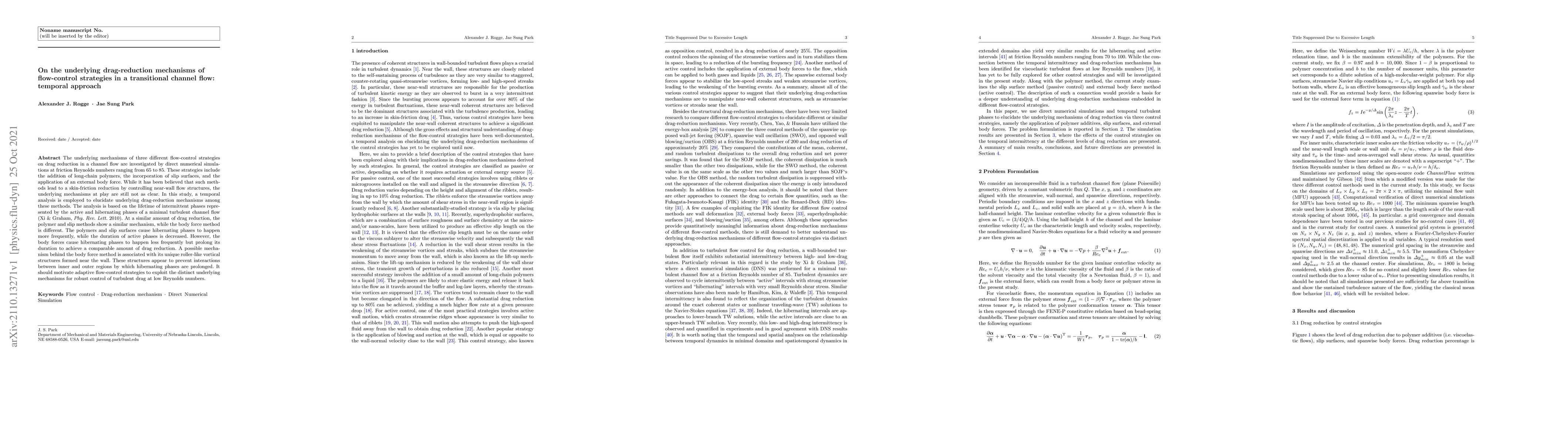 This study investigates the drag-reduction mechanisms of three flow-control strategies in transitional channel flow using direct numerical simulations. The analysis reveals that while polymers and slip surfaces increase hibernating phases and decrease active phases, the body force method prolongs hibernating phases and forms unique roller-like structures, suggesting distinct underlying mechanisms for each method.