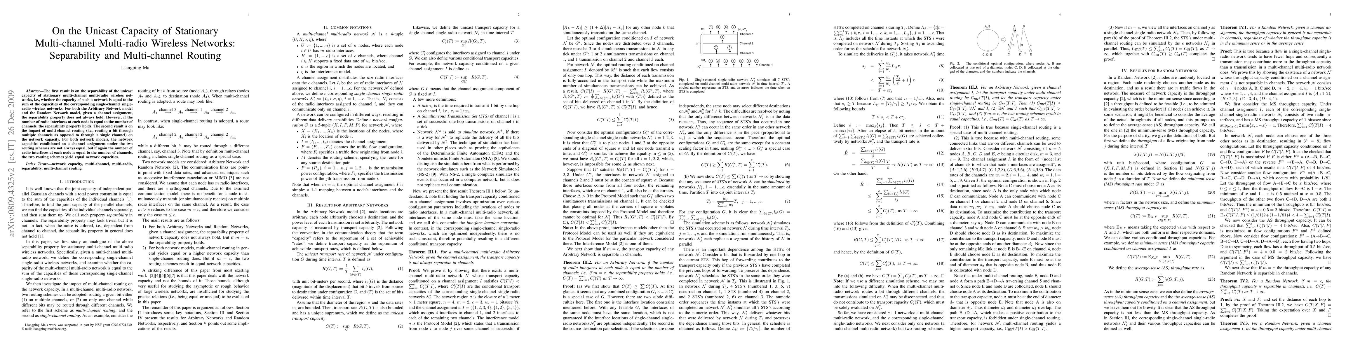 This paper investigates the unicast capacity in stationary multi-channel multi-radio wireless networks, finding that separability does not always hold but is achieved when each node has as many radio interfaces as there are channels. It also examines multi-channel routing, revealing that network capacities differ under various routing schemes unless the node radio-channel equivalence holds.