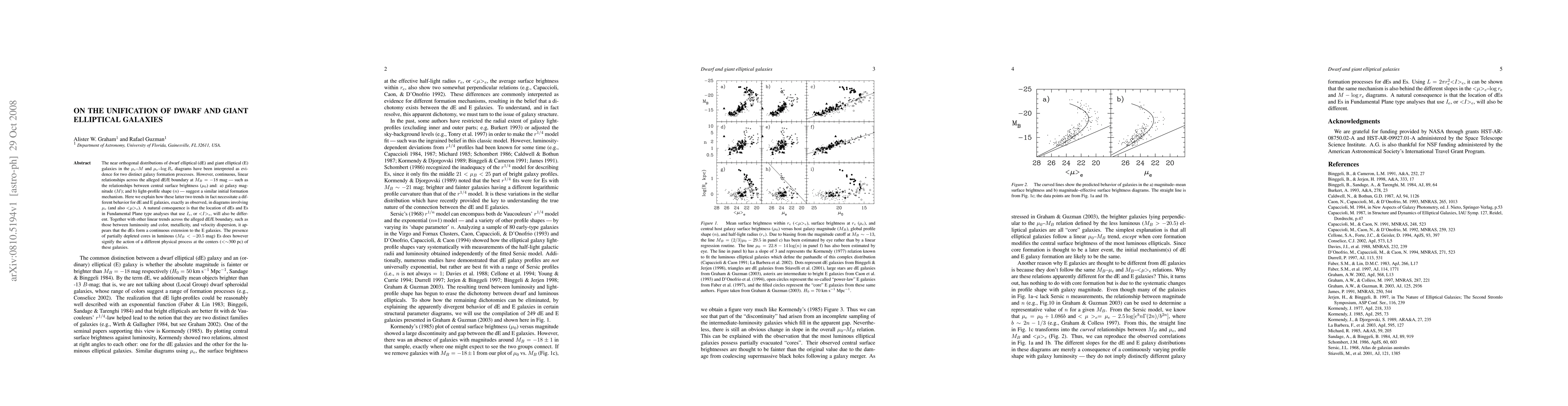 This paper argues that despite the apparent separation in diagrams, dwarf elliptical (dE) and giant elliptical (E) galaxies likely share a common formation mechanism, evidenced by continuous linear relationships across their supposed boundary. The study suggests that differences in behavior arise due to distinct physical processes affecting the centers of the larger galaxies.