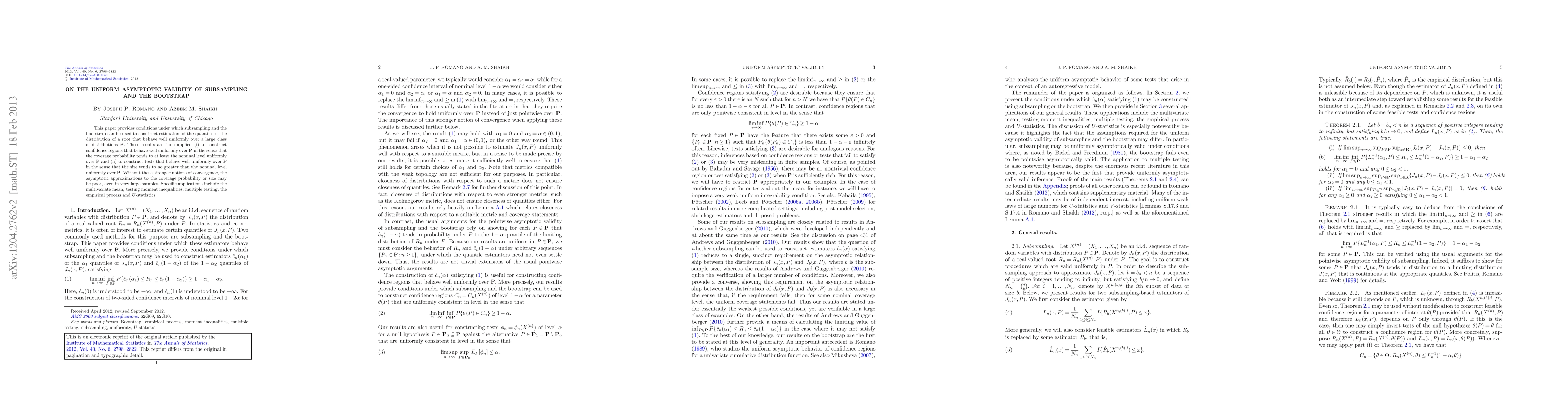 This paper provides conditions under which subsampling and the bootstrap can be used to construct estimators of the quantiles of the distribution of a root that behave well uniformly over a large class of distributions $\mathbf{P}$. These results are then applied (i) to construct confidence regions that behave well uniformly over $\mathbf{P}$ in the sense that the coverage probability tends to at least the nominal level uniformly over $\mathbf{P}$ and (ii) to construct tests that behave well uniformly over $\mathbf{P}$ in the sense that the size tends to no greater than the nominal level uniformly over $\mathbf{P}$. Without these stronger notions of convergence, the asymptotic approximations to the coverage probability or size may be poor, even in very large samples. Specific applications include the multivariate mean, testing moment inequalities, multiple testing, the empirical process and U-statistics.