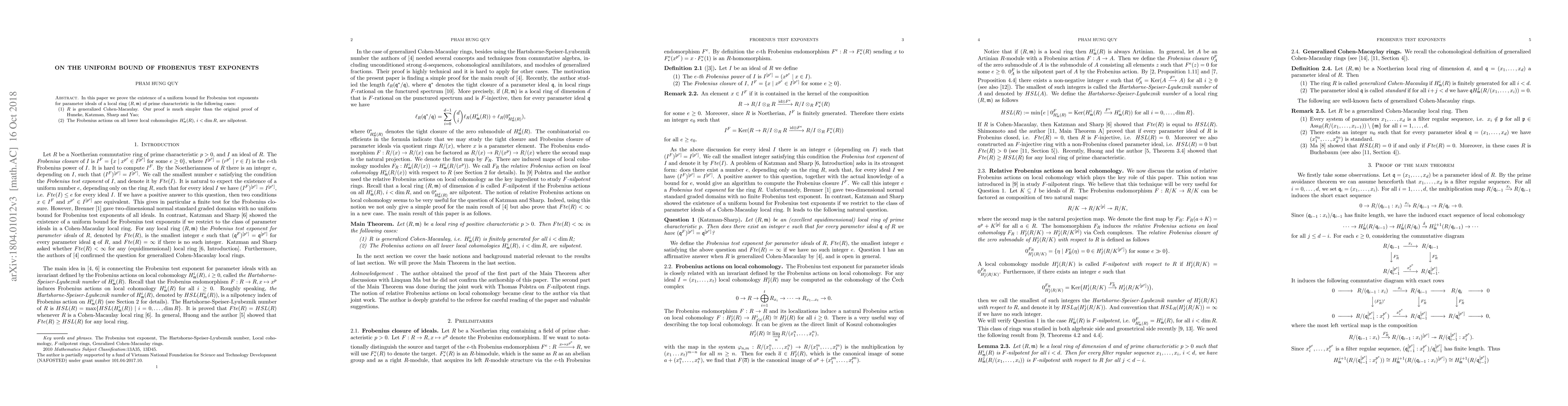 In this paper we prove the existence of a uniform bound for Frobenius test exponents for parameter ideals of a local ring $(R, \frak m)$ of prime characteristic in the following cases: (1) $R$ is generalized Cohen-Macaulay. Our proof is much more simpler than the original proof of Huneke, Katzman, Sharp and Yao, (2) The Frobenius actions on all lower local cohomologies $H^i_{\frak m}(R)$, $i < \dim R$, are nilpotent.