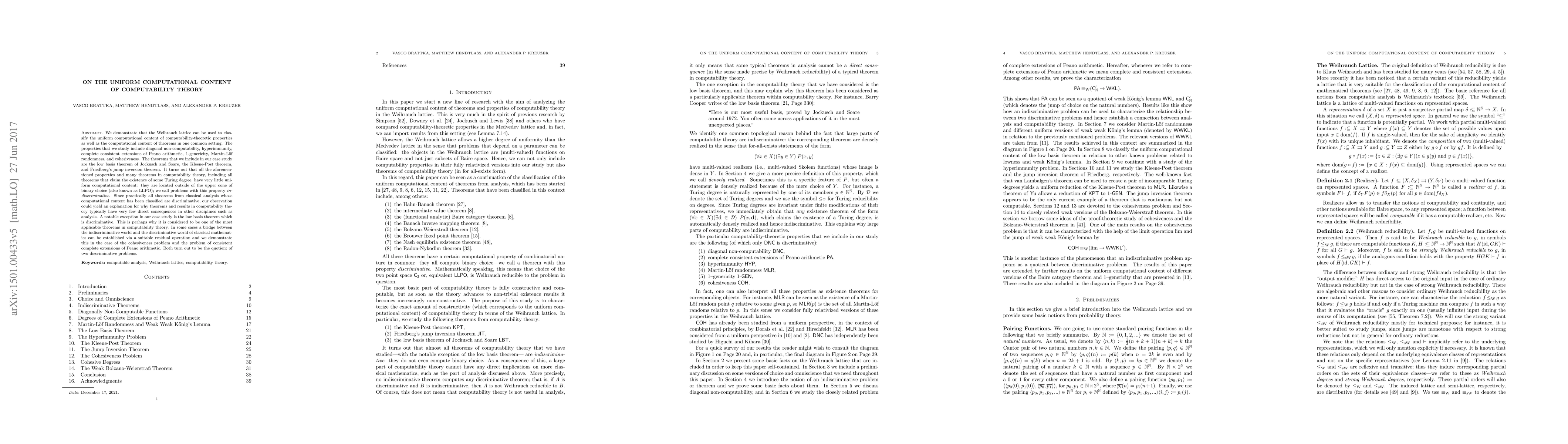This paper uses the Weihrauch lattice to classify the uniform computational content of various computability-theoretic properties and theorems, finding that most lack significant uniform computational content, termed indiscriminative. The low basis theorem is a notable exception, being discriminative and thus more applicable across disciplines.