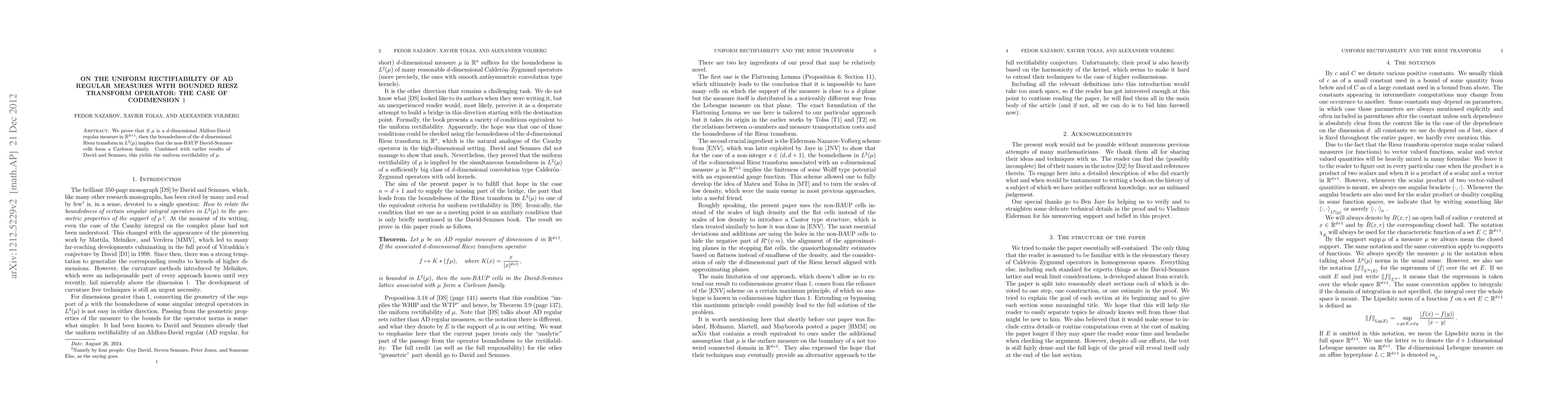 This paper proves that a d-dimensional Ahlfors-David regular measure in $\R^{d+1}$ with a bounded $d$-dimensional Riesz transform in $L^2(\mu)$ leads to the uniform rectifiability of $\mu$, leveraging earlier results by David and Semmes. The bounded Riesz transform implies that non-BAUP David-Semmes cells form a Carleson family.