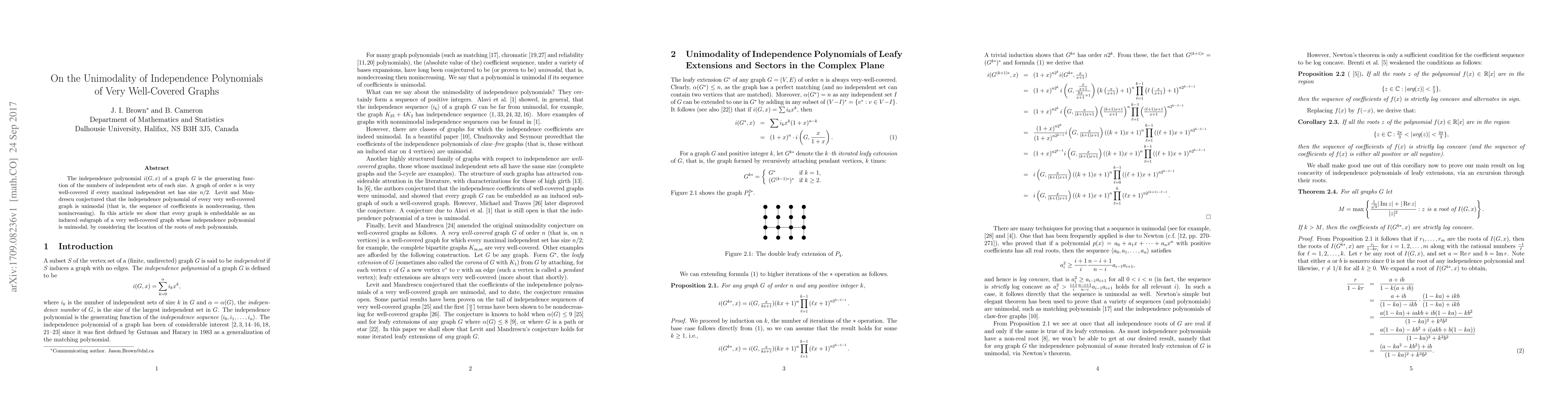 The independence polynomial $i(G,x)$ of a graph $G$ is the generating function of the numbers of independent sets of each size. A graph of order $n$ is very well-covered if every maximal independent set has size $n/2$. Levit and Mandrescu conjectured that the independence polynomial of every very well-covered graph is unimodal (that is, the sequence of coefficients is nondecreasing, then nonincreasing). In this article we show that every graph is embeddable as an induced subgraph of a very well-covered graph whose independence polynomial is unimodal, by considering the location of the roots of such polynomials.