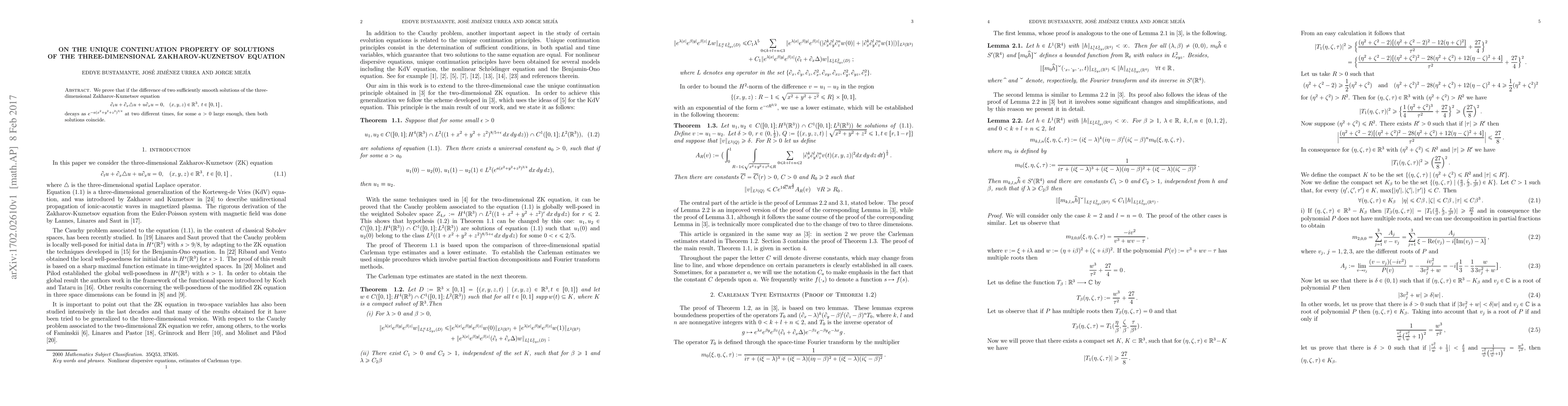 We prove that if the difference of two sufficiently smooth solutions of the three-dimensional Zakharov-Kuznetsov equation $$\partial_{t}u+\partial_{x}\triangle u+u\partial_{x}u=0 \text{,}\quad (x,y,z)\in\mathbb R^3, \;t\in[0,1],$$ decays as $e^{-a(x^2+y^2+z^2)^{3/4}}$ at two different times, for some $a>0$ large enough, then both solutions coincide.