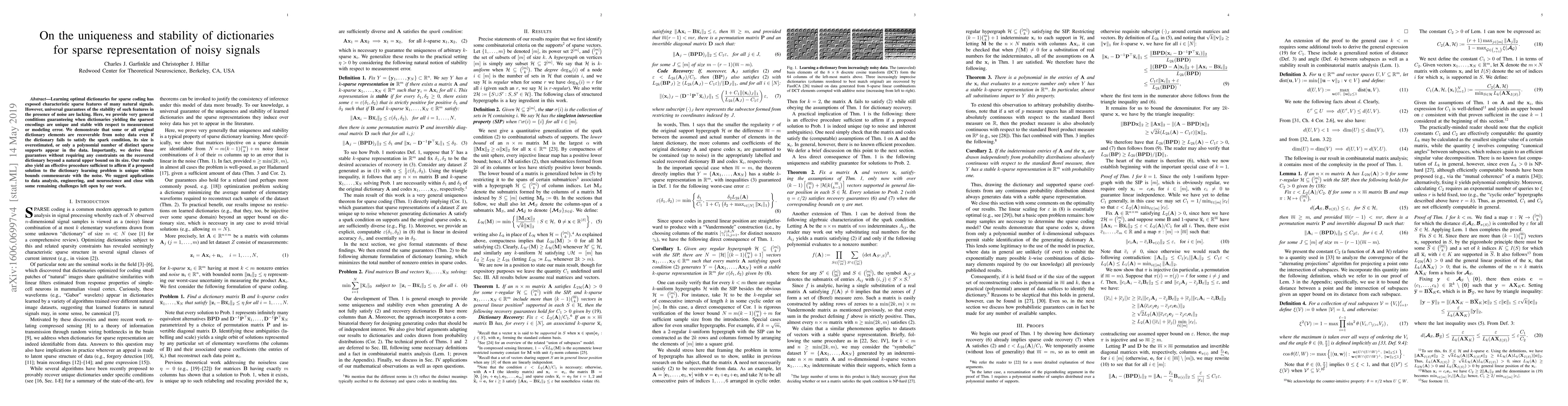 Learning optimal dictionaries for sparse coding has exposed characteristic sparse features of many natural signals. However, universal guarantees of the stability of such features in the presence of noise are lacking. Here, we provide very general conditions guaranteeing when dictionaries yielding the sparsest encodings are unique and stable with respect to measurement or modeling error. We demonstrate that some or all original dictionary elements are recoverable from noisy data even if the dictionary fails to satisfy the spark condition, its size is overestimated, or only a polynomial number of distinct sparse supports appear in the data. Importantly, we derive these guarantees without requiring any constraints on the recovered dictionary beyond a natural upper bound on its size. Our results also yield an effective procedure sufficient to affirm if a proposed solution to the dictionary learning problem is unique within bounds commensurate with the noise. We suggest applications to data analysis, engineering, and neuroscience and close with some remaining challenges left open by our work.