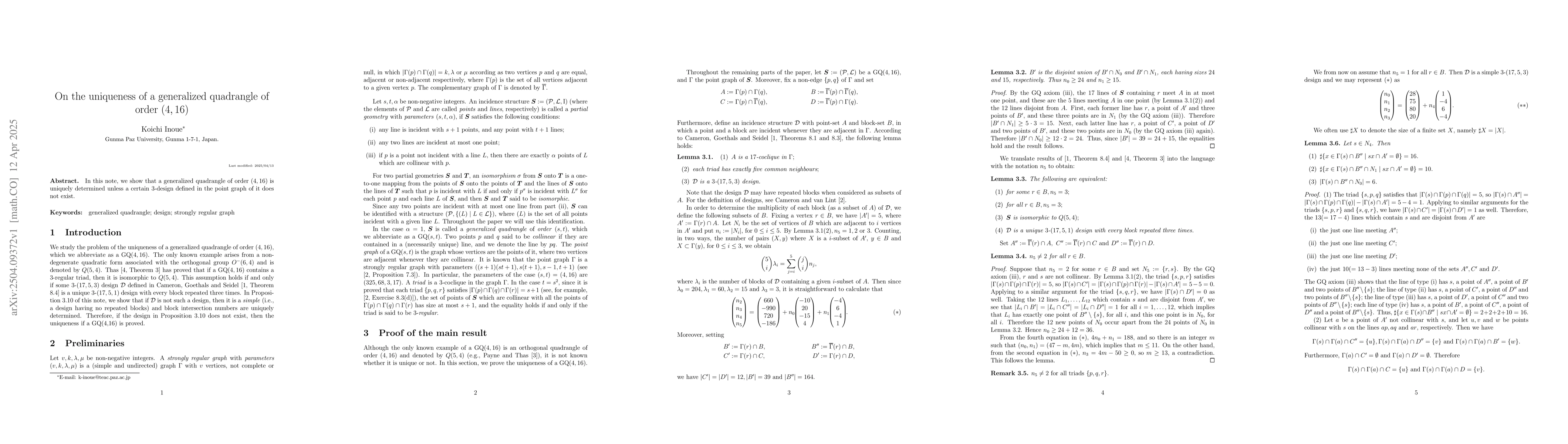 The paper presents a detailed analysis of the conditions under which a generalized quadrangle of order (4,16) is unique, focusing on the properties of a specific 3-design within its point graph.