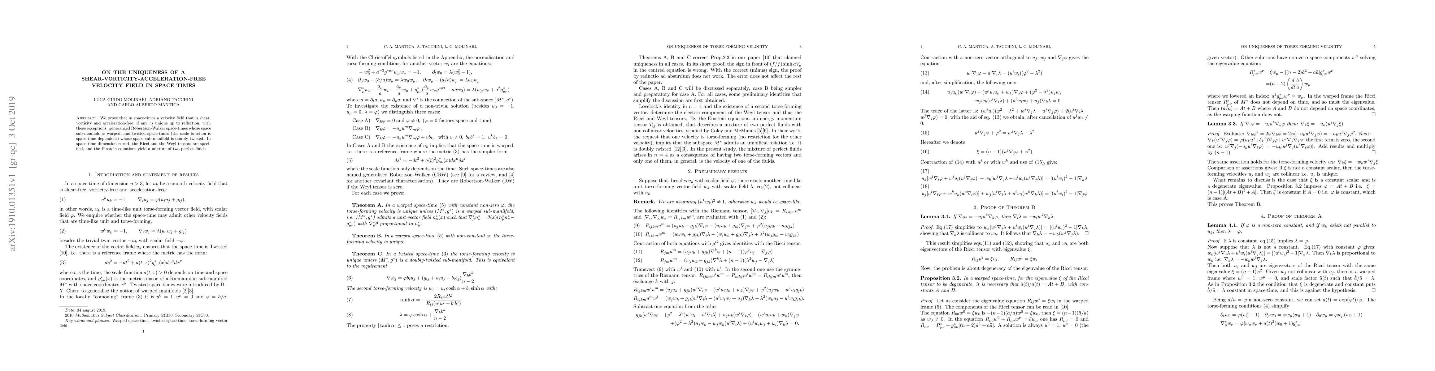 We prove that in space-times a velocity field that is shear, vorticity and acceleration-free, if any, is unique up to reflection, with these exceptions: generalized Robertson-Walker space-times whose space sub-manifold is warped, and twisted space-times (the scale function is space-time dependent) whose space sub-manifold is doubly twisted. In space-time dimension n = 4, the Ricci and the Weyl tensors are specified, and the Einstein equations yield a mixture of two perfect fluids.