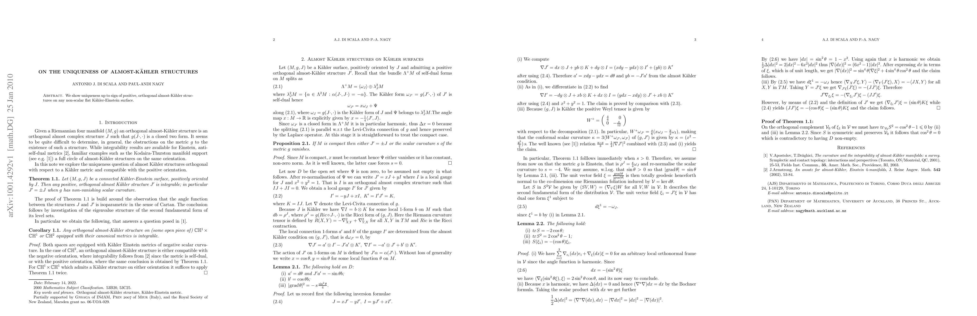 Summary: The paper demonstrates that positive, orthogonal almost-Kaehler structures on non-scalar flat Kaehler-Einstein surfaces are unique, up to a sign. This finding provides insight into the geometric properties of such surfaces.