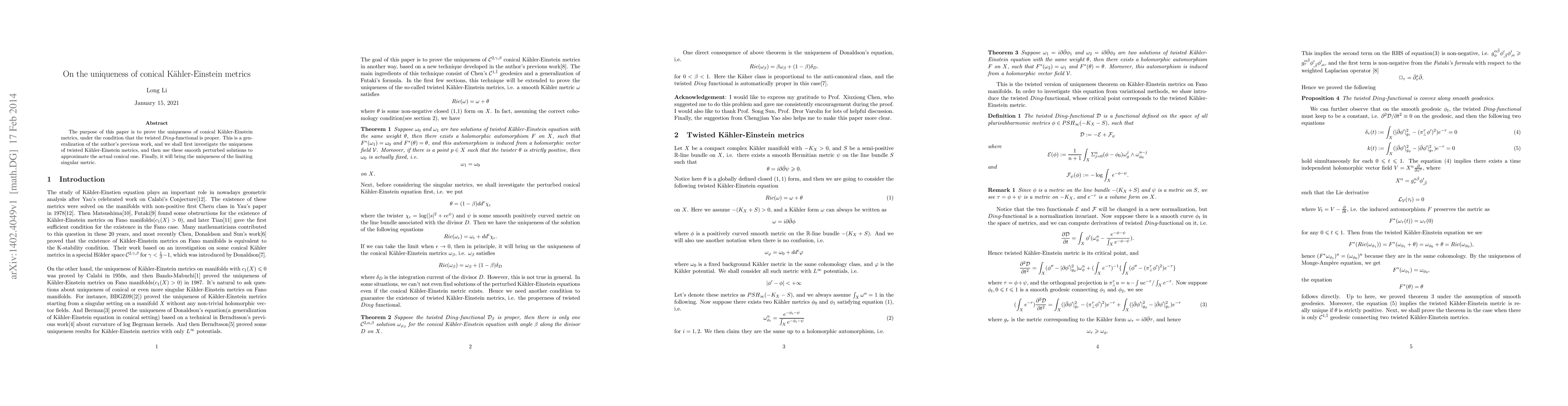 The purpose of this paper is to prove the uniqueness of conical K\"ahler-Einstein metrics, under the condition that the twisted $Ding$-functional is proper. This is a generalization of the author's previous work, and we shall first investigate the uniqueness of twisted K\"ahler-Einstein metrics, and then use these smooth perturbed solutions to approximate the actual conical one. Finally, it will bring the uniqueness of the limiting singular metric.