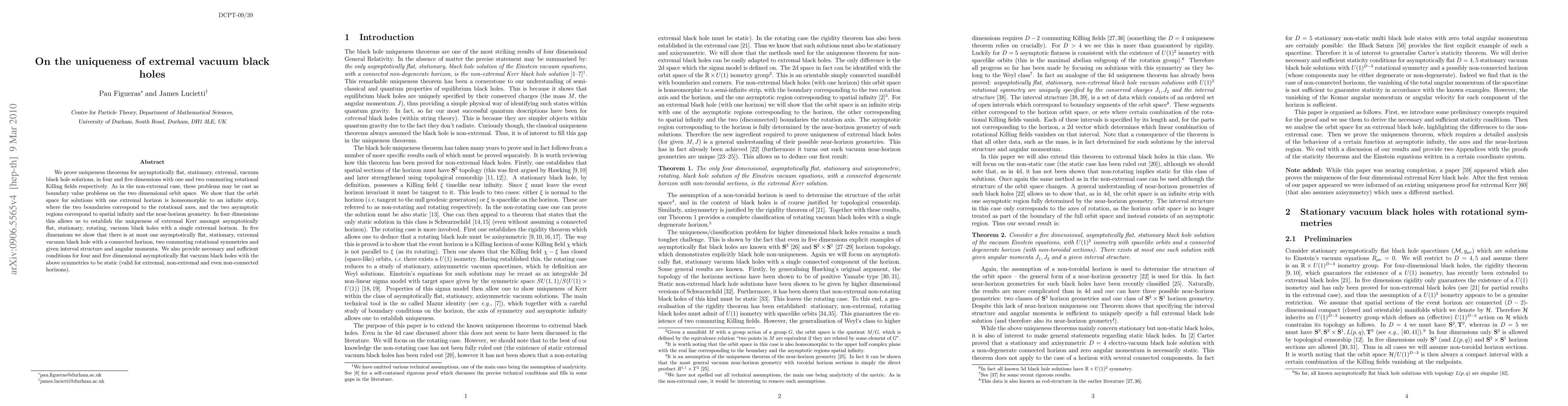 This paper proves uniqueness theorems for extremal vacuum black holes in four and five dimensions, showing that specific solutions are unique under certain conditions. It establishes that four-dimensional extremal Kerr black holes are unique and five-dimensional black holes with two commuting rotational symmetries also have unique properties, including static conditions.