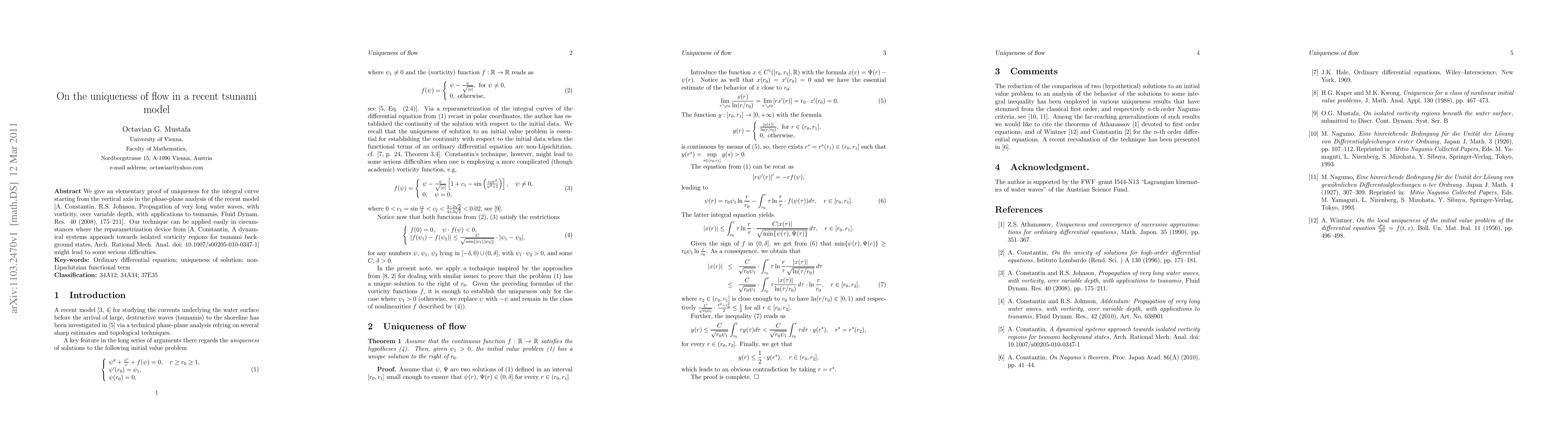 We give an elementary proof of uniqueness for the integral curve starting from the vertical axis in the phase-plane analysis of the recent model [A. Constantin, R.S. Johnson, Propagation of very long water waves, with vorticity, over variable depth, with applications to tsunamis, Fluid Dynam. Res. 40 (2008), 175--211]. Our technique can be applied easily in circumstances where the reparametrization device from [A. Constantin, A dynamical systems approach towards isolated vorticity regions for tsunami background states, Arch. Rational Mech. Anal. doi: 10.1007/s00205-010-0347-1] might lead to some serious difficulties.