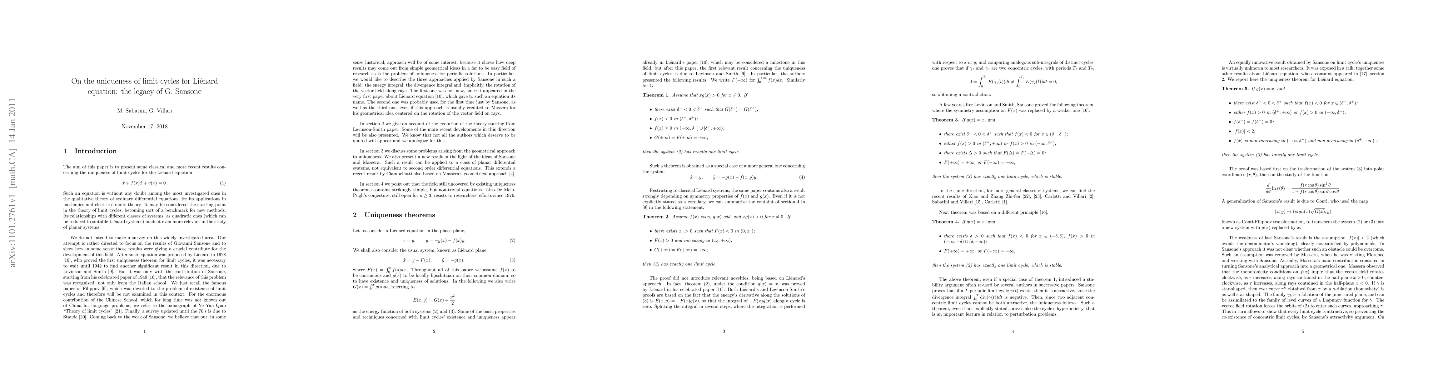 We give an account of the results about limit cycle's uniqueness for Li\'enard equations, from Levinson-Smith's one to the most recent ones. We present a new uniqueness theorem in the line of Sansone-Massera's geometrical approach.