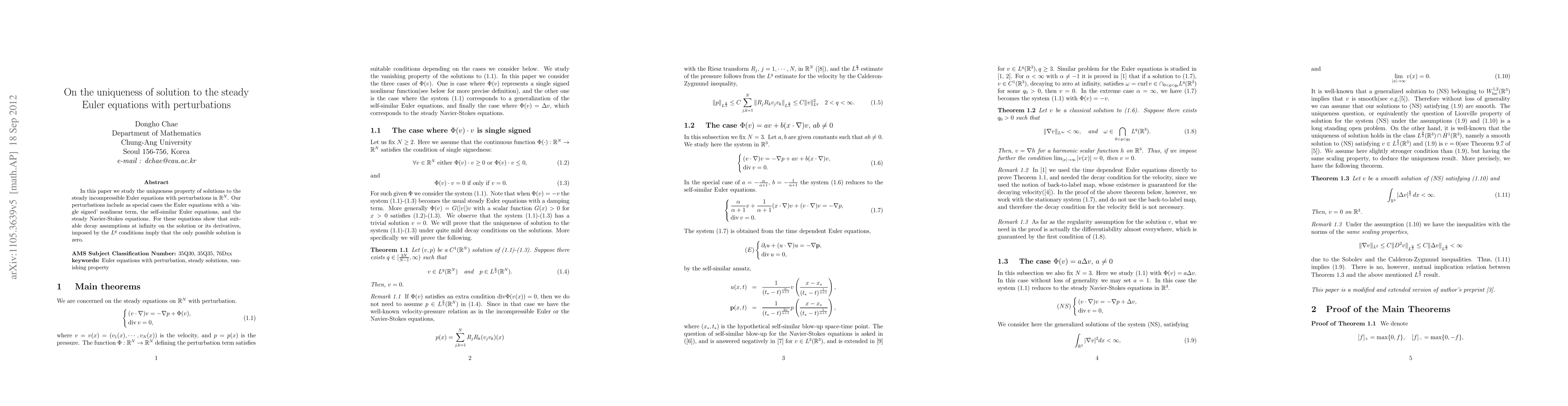 This paper investigates the uniqueness of solutions to the steady incompressible Euler equations with perturbations in $\Bbb R^N$, showing that under suitable decay conditions, the only solution is zero, encompassing special cases like the Euler equations with a single signed nonlinear term and the steady Navier-Stokes equations.
