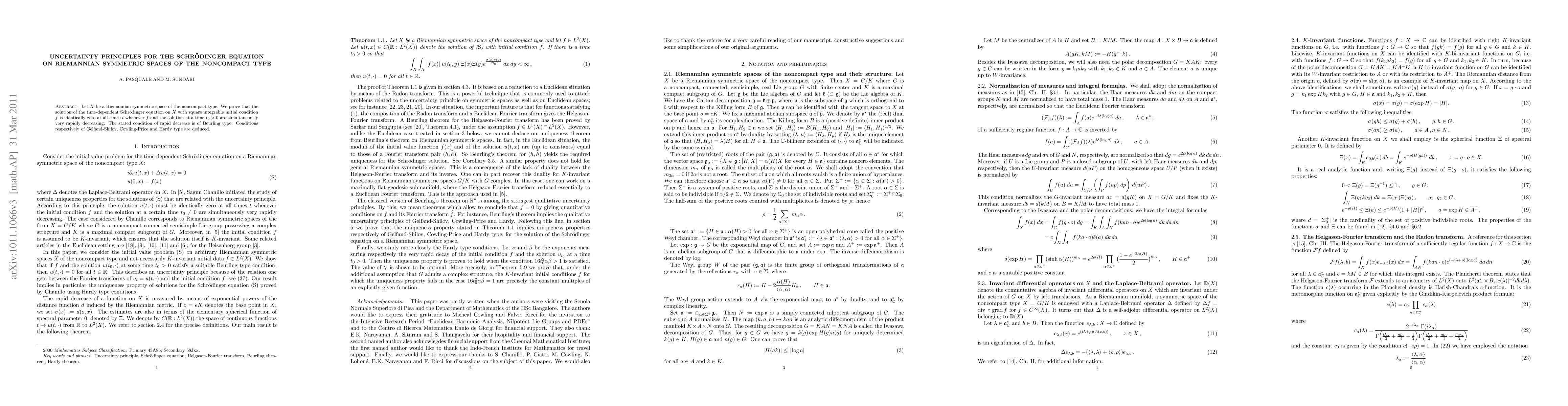 This paper proves that on Riemannian symmetric spaces of the noncompact type, the time-dependent Schrödinger equation's solution is identically zero if both the initial condition and the solution at a positive time are very rapidly decreasing, specifically of Beurling type. It also derives conditions of Gelfand-Shilov, Cowling-Price, and Hardy types.