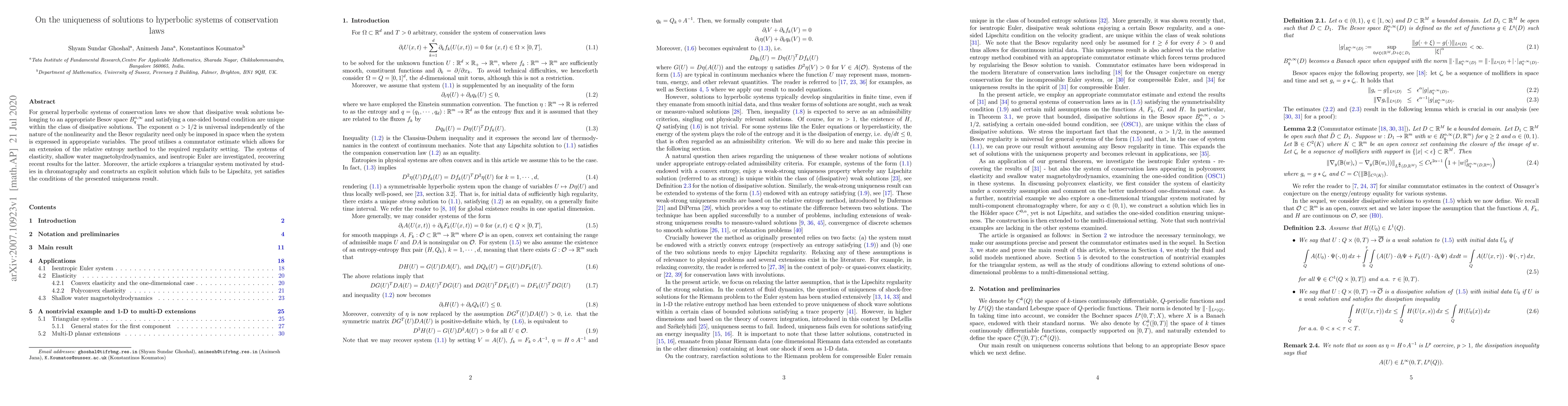 This paper demonstrates the uniqueness of dissipative weak solutions for hyperbolic conservation laws in a Besov space, provided they satisfy a one-sided bound condition. The proof leverages a commutator estimate to extend the relative entropy method, applicable to systems like elasticity, shallow water, and Euler.