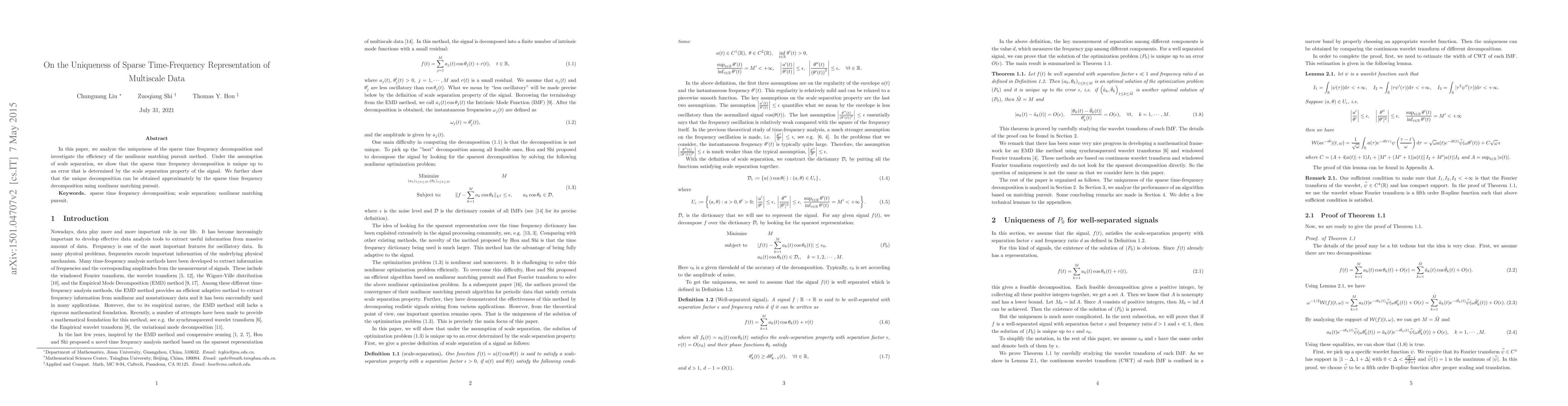 In this paper, we analyze the uniqueness of the sparse time frequency decomposition and investigate the efficiency of the nonlinear matching pursuit method. Under the assumption of scale separation, we show that the sparse time frequency decomposition is unique up to an error that is determined by the scale separation property of the signal. We further show that the unique decomposition can be obtained approximately by the sparse time frequency decomposition using nonlinear matching pursuit.