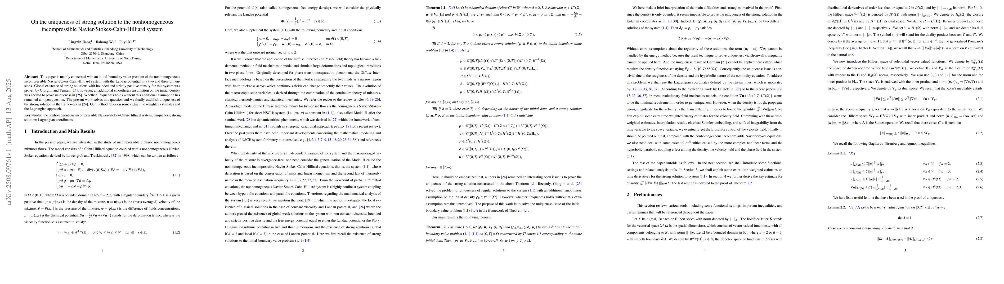 This paper is mainly concerned with an initial-boundary value problem of the nonhomogeneous incompressible Navier-Stokes-Cahn-Hilliard system with the Landau potential in a two and three dimensions. Global existence of strong solutions with bounded and strictly positive density for this system was proven by Giorgini and Temam \cite{GT}; however, an additional smoothness assumption on the initial density was needed to prove uniqueness in \cite{GT1}. Whether uniqueness holds without this additional assumption has remained an open question. The present work solves this question and we finally establish uniqueness of the strong solution in the framework in \cite{GT}. Our method relies on some extra time weighted estimates and the Lagrangian approach.