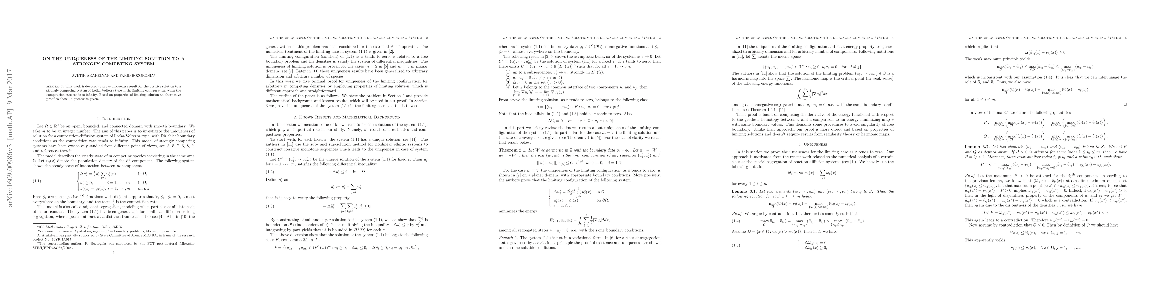 This work is devoted to prove uniqueness result for the positive solution to a strongly competing system of Lotka - Volterra type in the limiting configuration, when the competition rate tends to infinity.