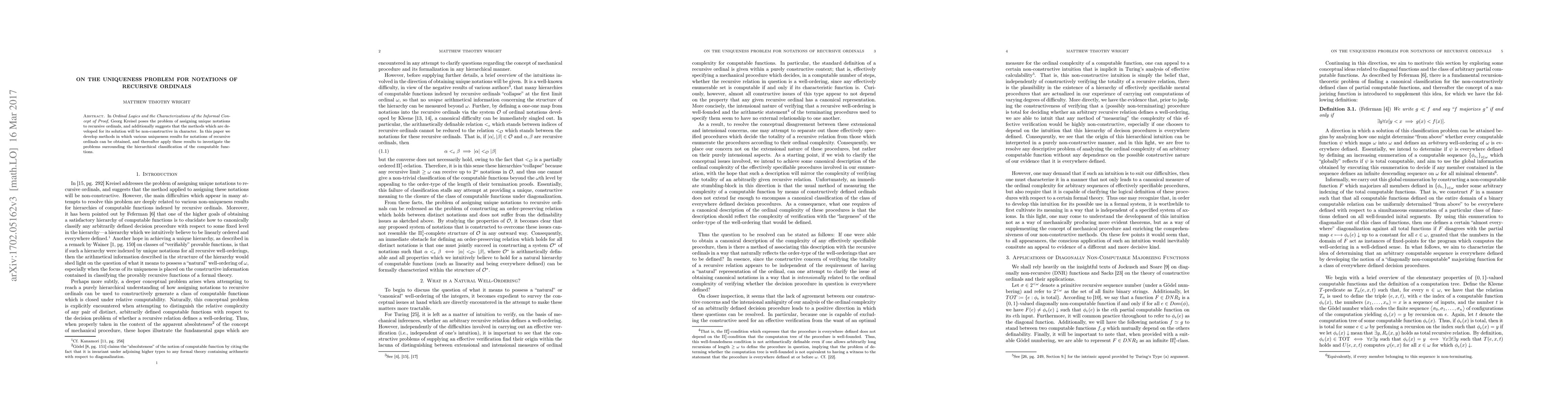 In the article 'Ordinal Logics and the Characterizations of the Informal Concept of Proof', Georg Kreisel poses the problem of assigning unique notations to recursive ordinals, and additionally suggests that the methods which are developed for its solution will be non-constructive in character. In this paper we develop methods in which various uniqueness results for notations of recursive ordinals can be obtained, and thereafter apply these results to investigate the problems surrounding the hierarchical classification of the computable functions.