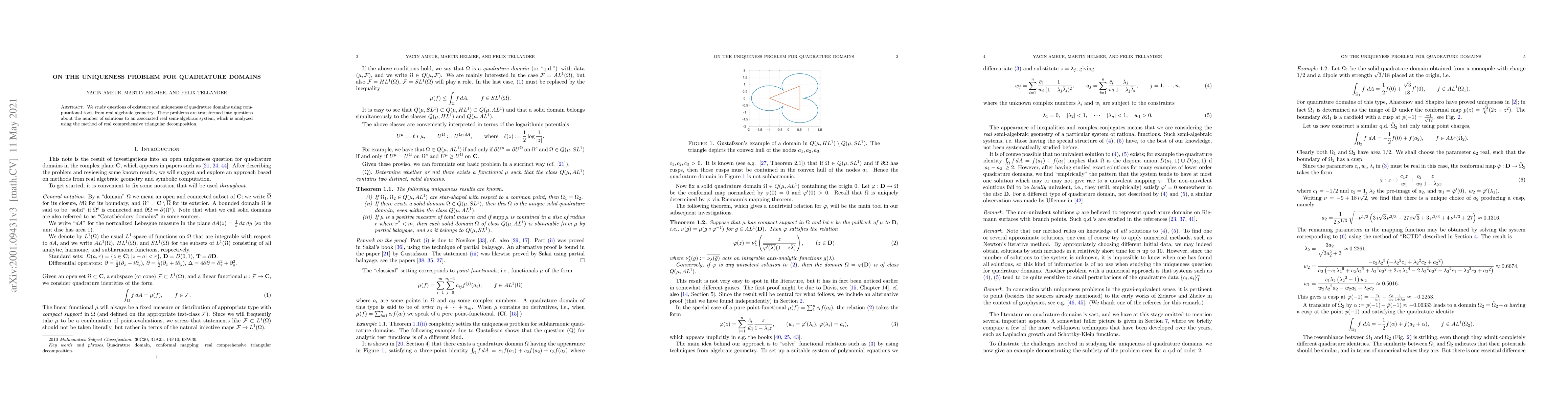 We study questions of existence and uniqueness of quadrature domains using computational tools from real algebraic geometry. These problems are transformed into questions about the number of solutions to an associated real semi-algebraic system, which is analyzed using the method of real comprehensive triangular decomposition.